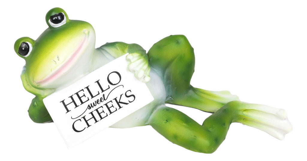 • This Corny Frog Toilet Seat Topper Figurine sculpture is 3.25" tall, 7.75" wide and 3.25" deep approximately. It weighs about 12 ounces. • This Corny Frog Toilet Seat Topper Figurine is made of designer composite resin, hand painted and polished individually. Color tone may vary slightly from pictures. • He is the Prince Charming of the fairy tales but in this case, he is the only one that will follow you to the ends of the world... even to the toilet seat! Enjoying the view where he is at (at the top of your toilet seat frame), Prince Charming has his right hand cupping his cheek while he lies flat on his side in recovery position. A wide smile on his face and his eyes sheepish, Prince Charming Frog is holding a sign that says 'Hello Sweet Cheeks'. • A hilarious sculpture to decorate a boring toilet seat, in your powder room or bathrooms. He will make your day whenever you see him! The sculpture will also go well even on your tabletops, bars, shelves and more! • Props in photos are not included with the item. They are meant to provide size perspective of the item.