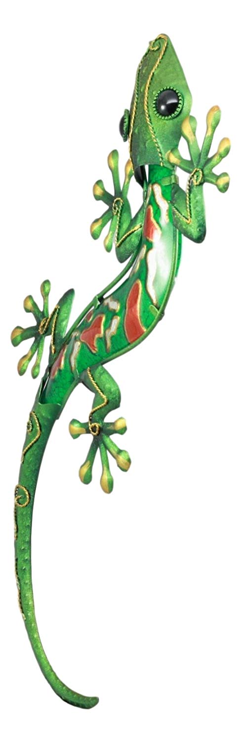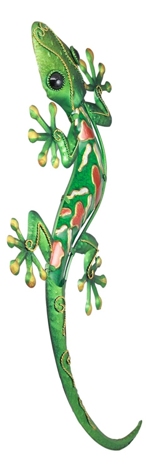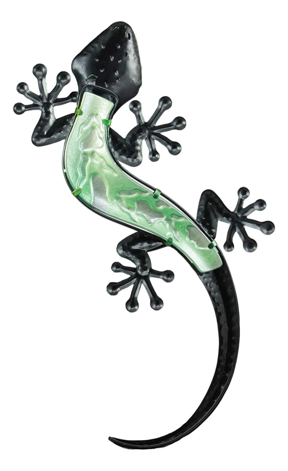 • The Climbing Gecko Lizard Metal Wall Art will gladly sun itself on your wall while spicing up the area with its colorful appeal. This metal wall art depicts a stylized gecko with a curved tail and body with geometric designs, all in warm colors of summer greens. In the center focal point of the lizard is a handblown glass art that will provide depth and accent to the decor!