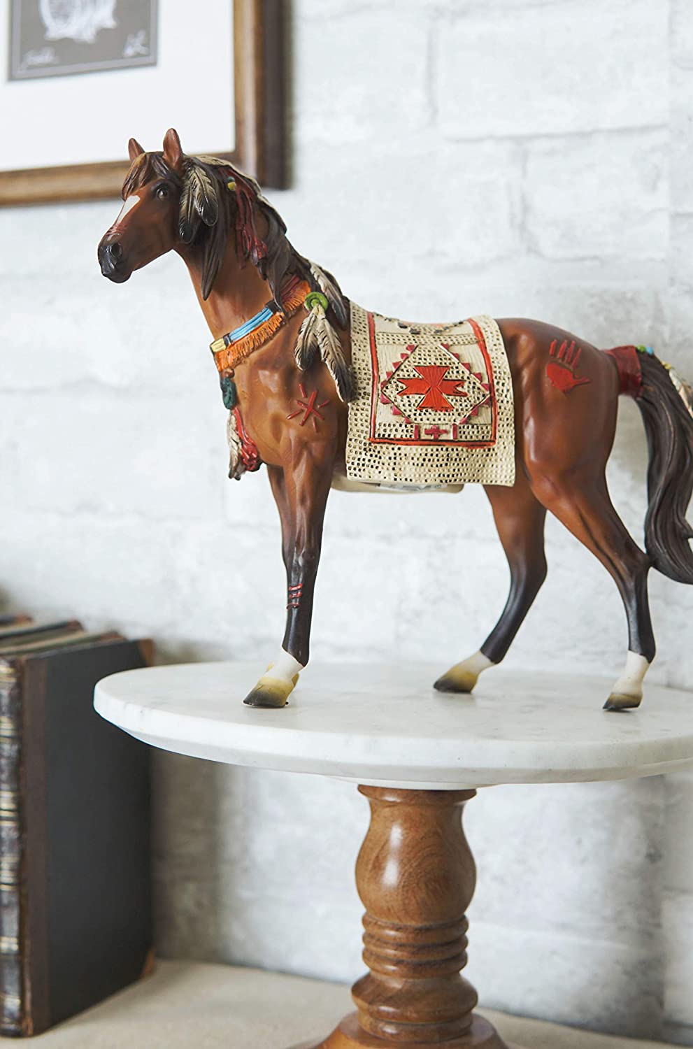 • This sculpture showcases the thoroughbred pride of the native navajo equestrian family. Beautifully sculpted and painted, this figurine accentuates the spiritual medicine horse. A brown horse is painted with the red palm and vector symbols, embellished with feathers, tapestry saddle and many more accessories.