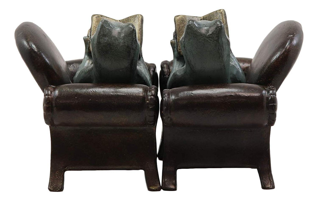• These Reading Frogs On Sofas Bookends Set stands at 5.25" Tall, 7.25" Wide and 4.25" Deep each approximately. The set weighs 4.75 pounds. • These Reading Frogs On Sofas Bookends Set is made of designer aluminum, hand painted and polished individually. The sculptures are painted in verdi green and gold for a classy rich finish. Color tone may vary slightly from pictures.. • Resting on their own sofa couches, these frogs are retiring for the day with their favorite books. These whimsical accent bookends are perfect for your desks, shelves or what have you! • This is an Ebros exclusive collection. It comes with our Ebros Gift Satisfaction Guarantee when sold by Ebros Gift. Coke can and props placed next to the statue are not included with the listing. They are meant to provide size perspective of the item.
