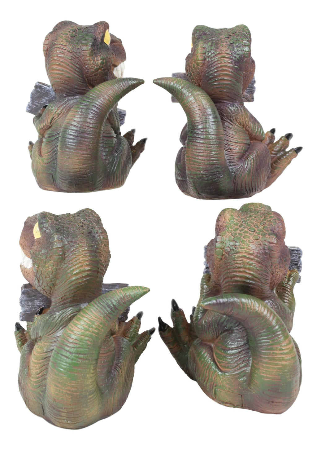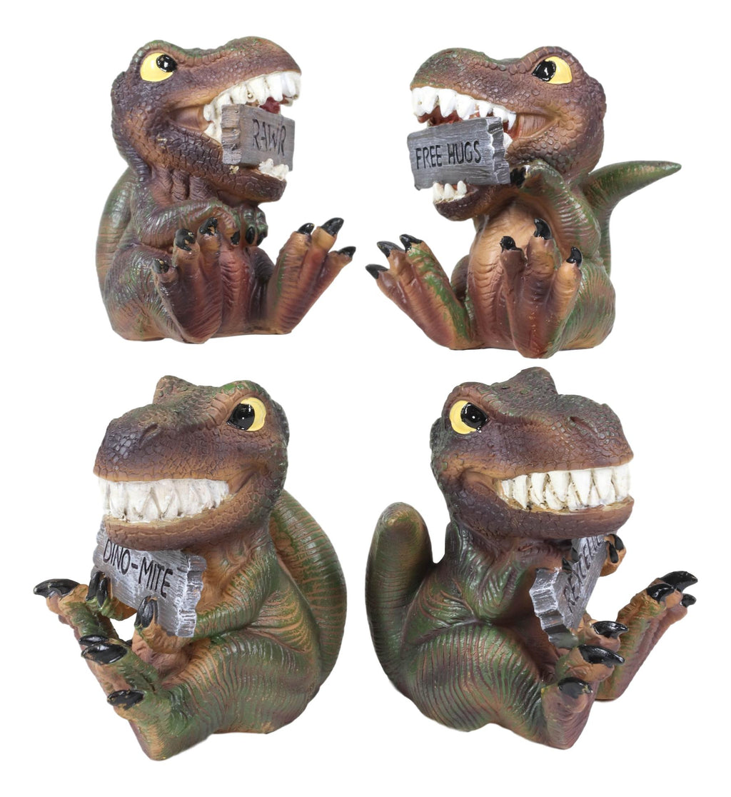 • These Tyrannosaurus Rex Baby figurines each measures about 4" tall, 4" wide and 3.25" deep approximately. Each piece weighs about 9 ounces. • These Tyrannosaurus Rex Baby figurines are made of high quality designer resin, individually handpainted and polished. Because each piece is partially hand crafted, color tone may vary from pictures. • Bring back the Jurassic era to your home or your loved one's with this Jurassic Proclamations T-Rexes! These apex predators are baring their teeth with a cheeky grin, some holding plank signs in their hands and some biting them between their teeth. The signs read 'Rawr' 'Free Hugs' 'Dino-Mite' and 'Rexcellent'.