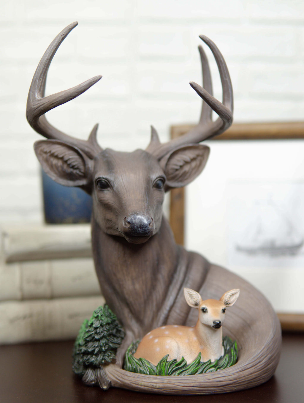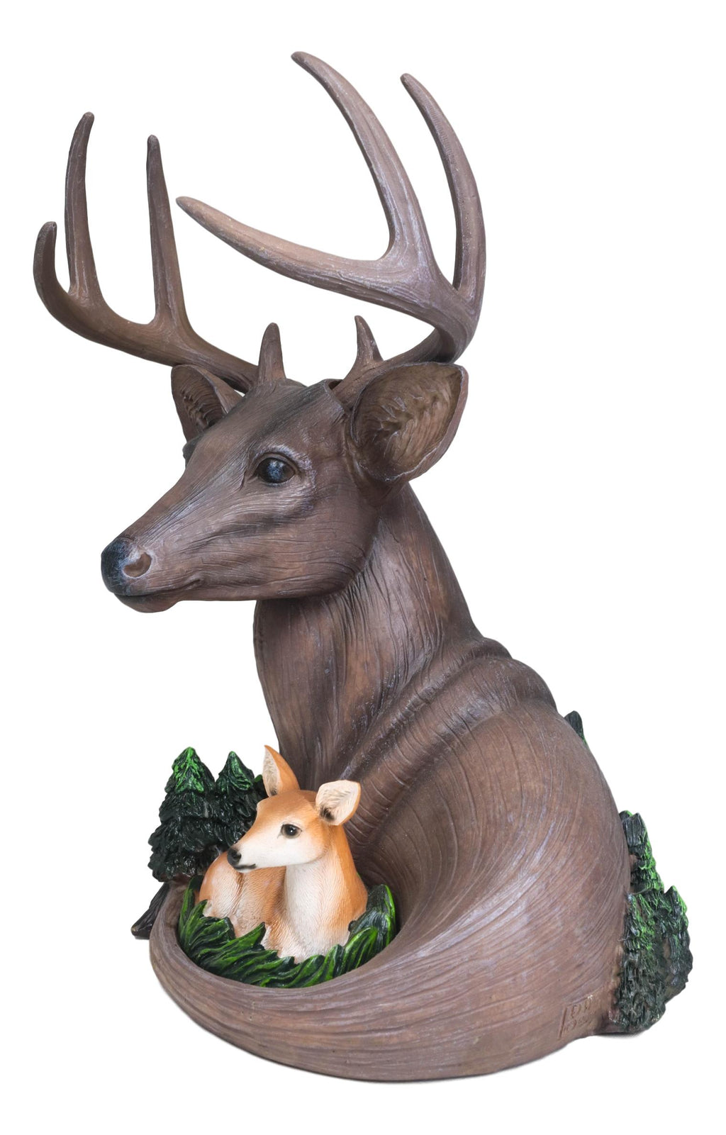 • This Wildlife Whitetail Buck Deer figurine measures 11" tall, 8.75" long and 7" deep approximately. It weighs about 2.75 pounds. • This Wildlife Whitetail Buck Deer figurine is made of high quality designer resin, individually hand painted and polished. Color tone may vary slightly from pictures. • This stunning wildlife scene sculpture features a 8 point whitetail buck protecting his fawn baby in his bosom. The buck is finished in deep faux wood finish while the fawn and the pine trees are vividly colored to add vigor and life to the sculpture. • Soda can and props in photos are not included with the item.