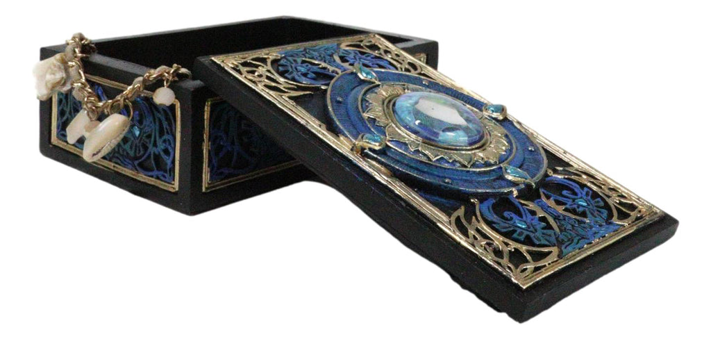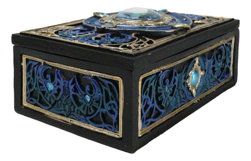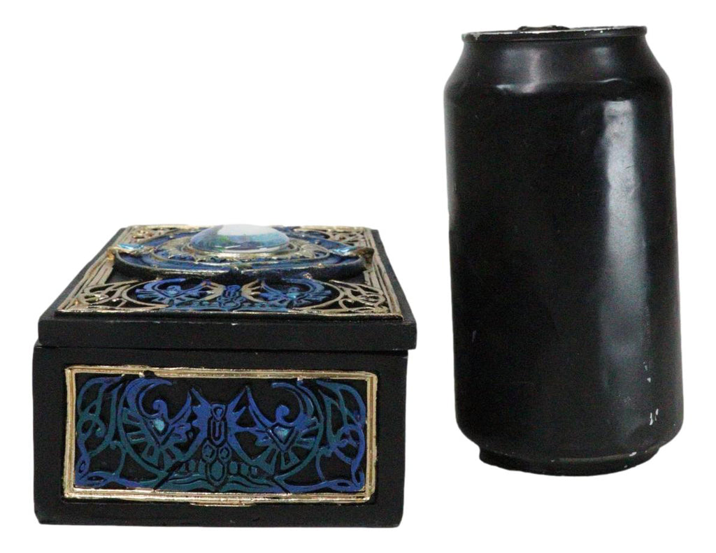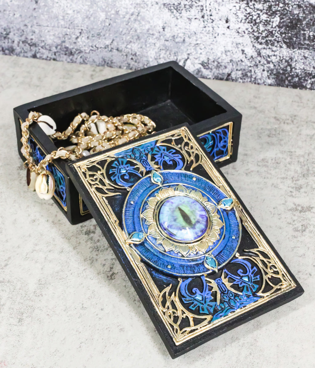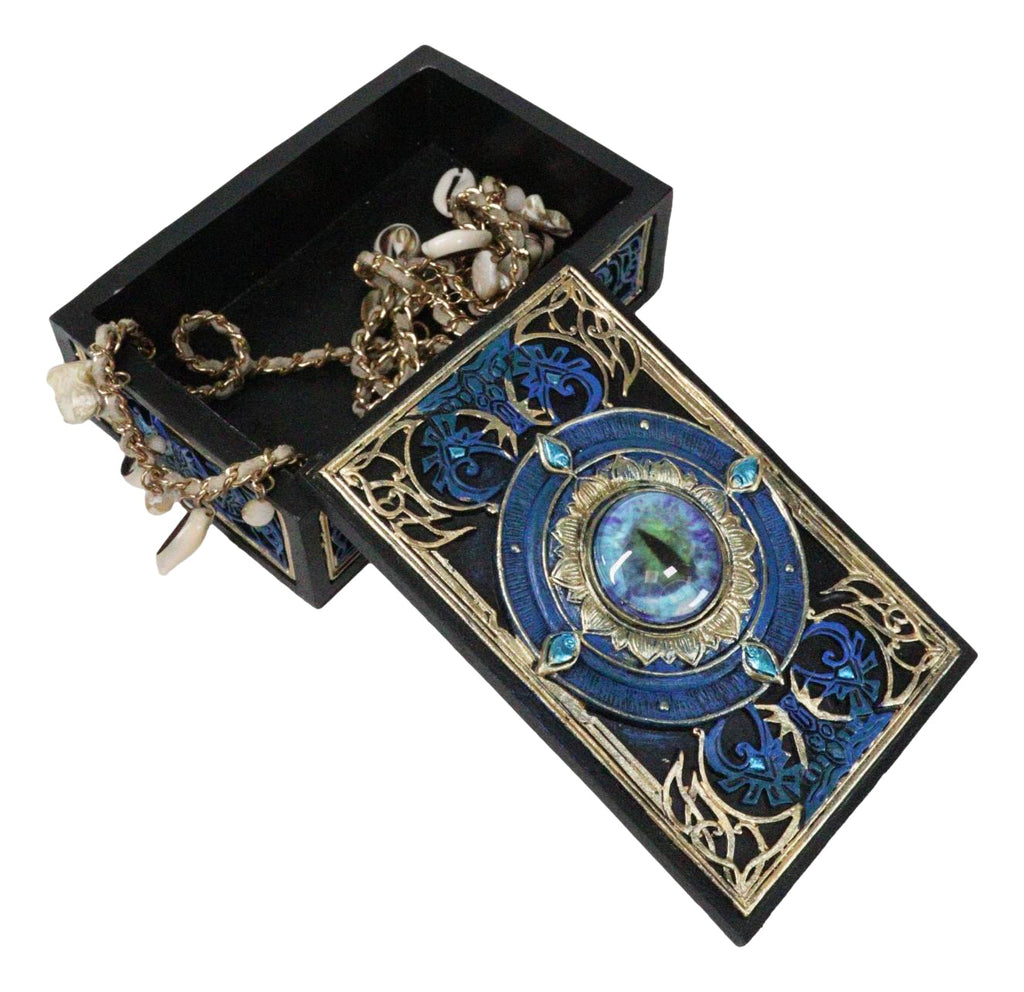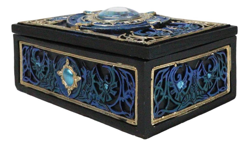 • This All Seeing Eye sculptural tarot card box with lid measures 2.25" High 5.5" Wide and 3.75" Deep. It weighs about 1.5 pounds. • This All Seeing Eye sculptural tarot card box with lid is made of polyresin, hand painted and polished individually. • Tarot card reading is the practice of using tarot cards to gain insight into the past, present or future by formulating a question, then drawing and interpreting cards. Reading tarot cards is a type of cartomancy. A regular tarot deck consists of 78 cards, which can be split into two groups, the major arcana and minor arcana • The box can used for multi purposes. You can use it to keep precious stones, watches, keepsakes, coins, tarot cards, herbs, fengshui items or just a touch of elegance and design to your dressing table or home. • Props, cards and Jewelry in photos are not included with the listing.