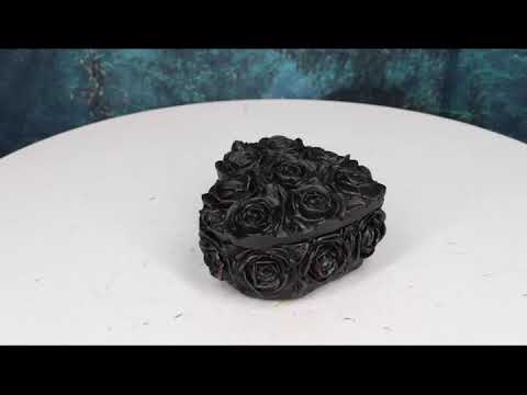 • If you enjoy the look of black roses, especially in your favorite spaces, you should make sure to check out this Black Rose Heart Box. This heart-shaped box has a removable lid on top. Black roses adorn the lid and sides of the gothic trinket box. The tips of the petals on each 3D rose have a dark red tint. Add this boudoir rose box to your gothic home or office decor. It makes a lovely collectible or gift for any lover of gothic style or roses.