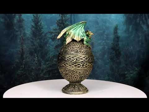 • This is an exotic decorative box for keepsakes, jewelry, and other small knick knacks. This Fearsome Green Dragon is guarding a Celtic Relic in the shape of an egg containing ancient old secrets of the Middle Earth lands. The dragon egg is beautifully designed with celtic knotwork all around.