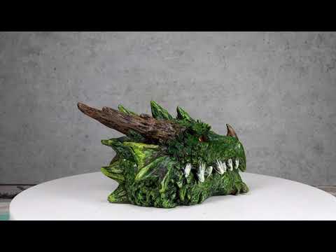 • Need a bold statement piece to help fill out your decore? This dragon head fits the bill! The head is intricately detailed with plenty of texture and angles. The beast is done in shades of green and brown. Likened to the greenman tree spirit deity, the dragon has green leaf foliage skin and dendritic branch spiked horns. The top part of the skull lifts off to reveal a container to stash your secret 'stuff'.