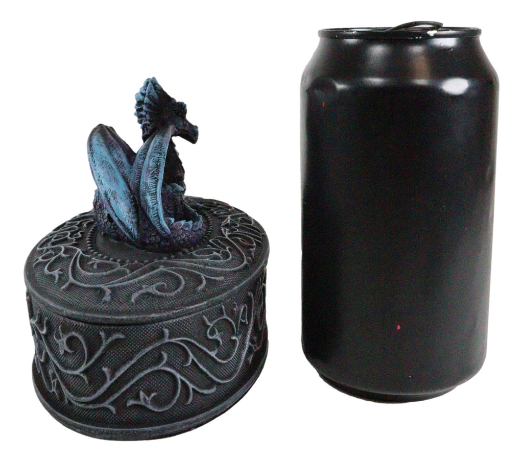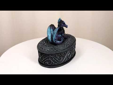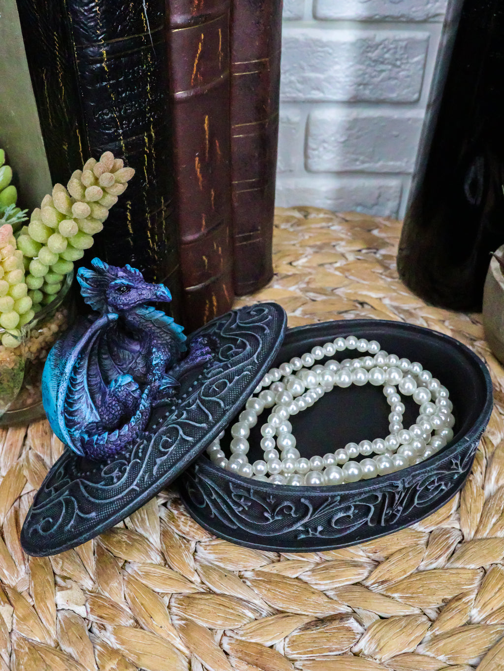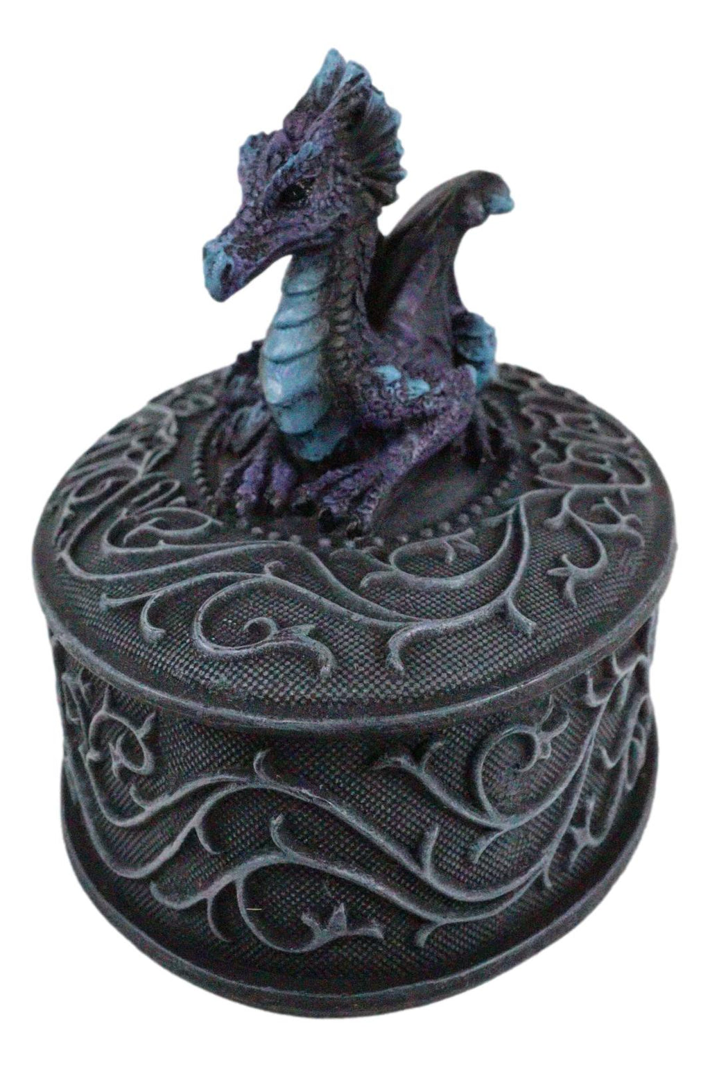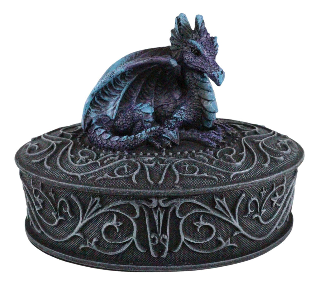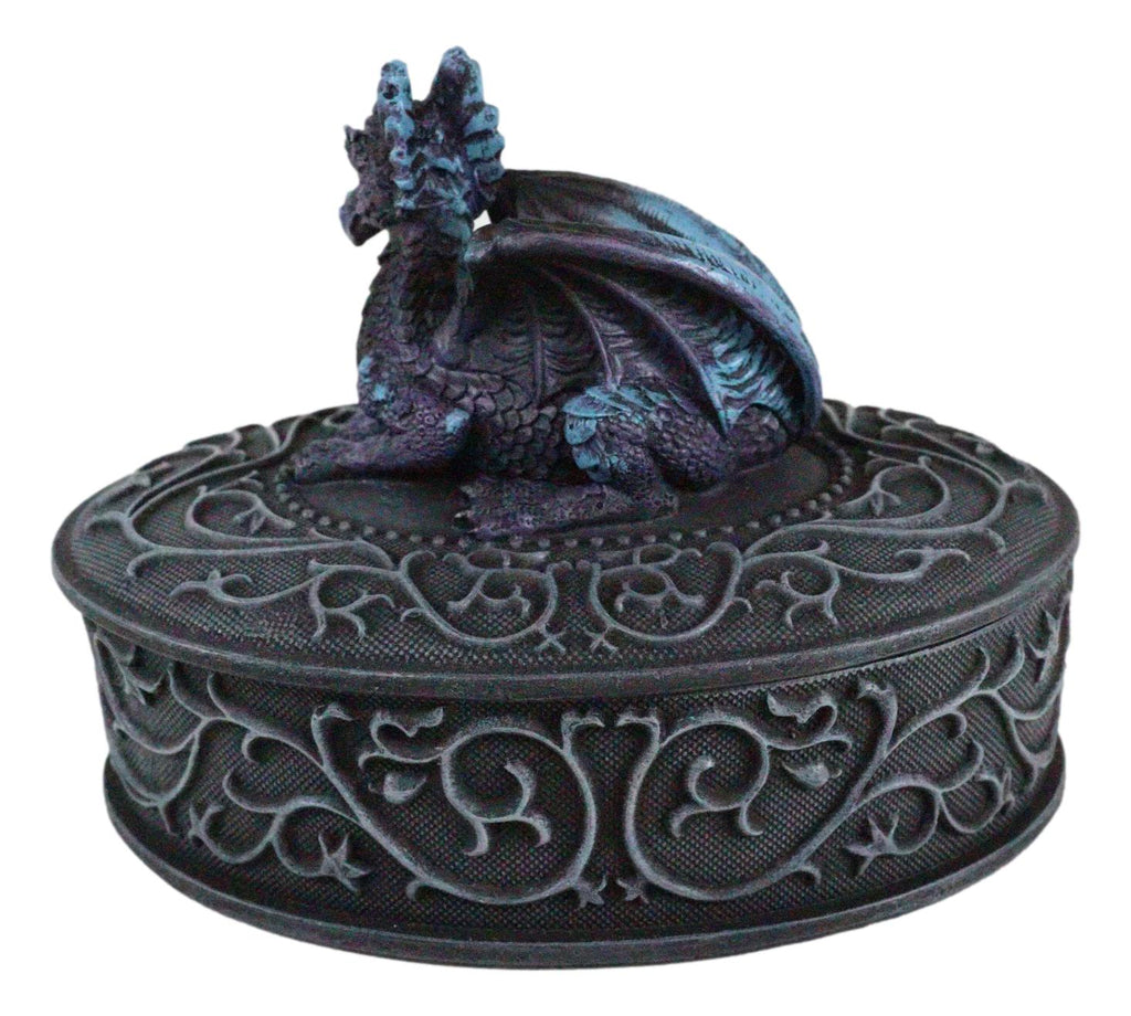• Perfect for storing many of your small items with ease, this Oval Medieval Dragon Trinket Box is just as decorative as it is quite useful. Covering the surface of the box are lovely medieval ivy accents that create an authentic look. A stunning blue and purple dragon sits perched on top of the box, acting as both a decoration and a handle.