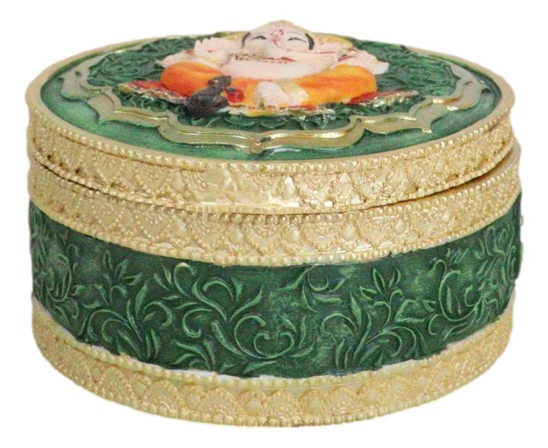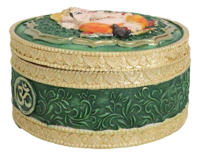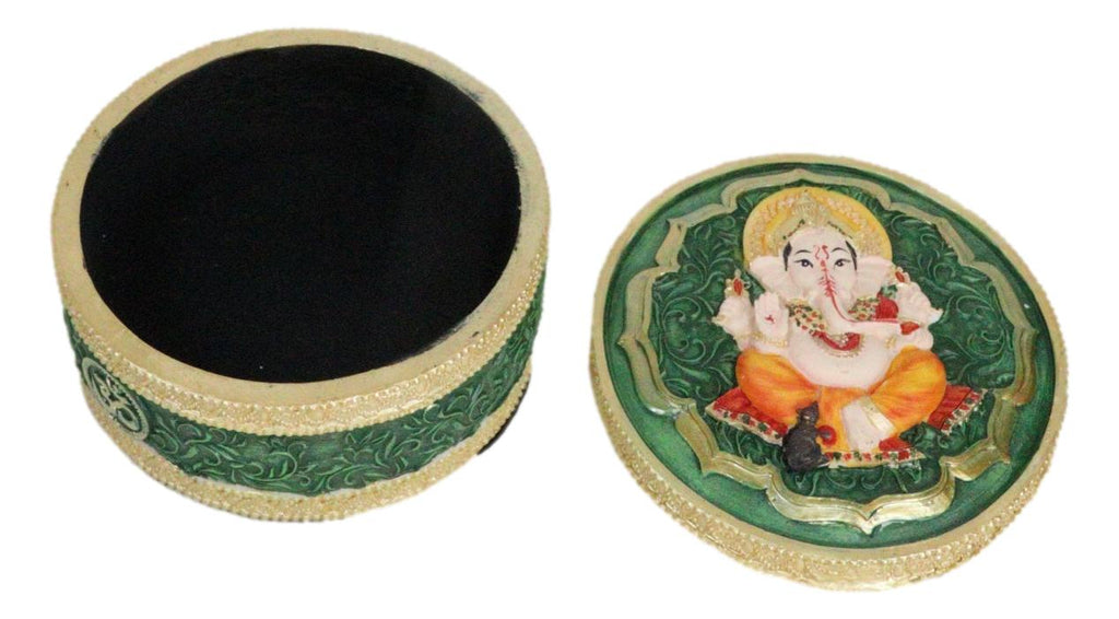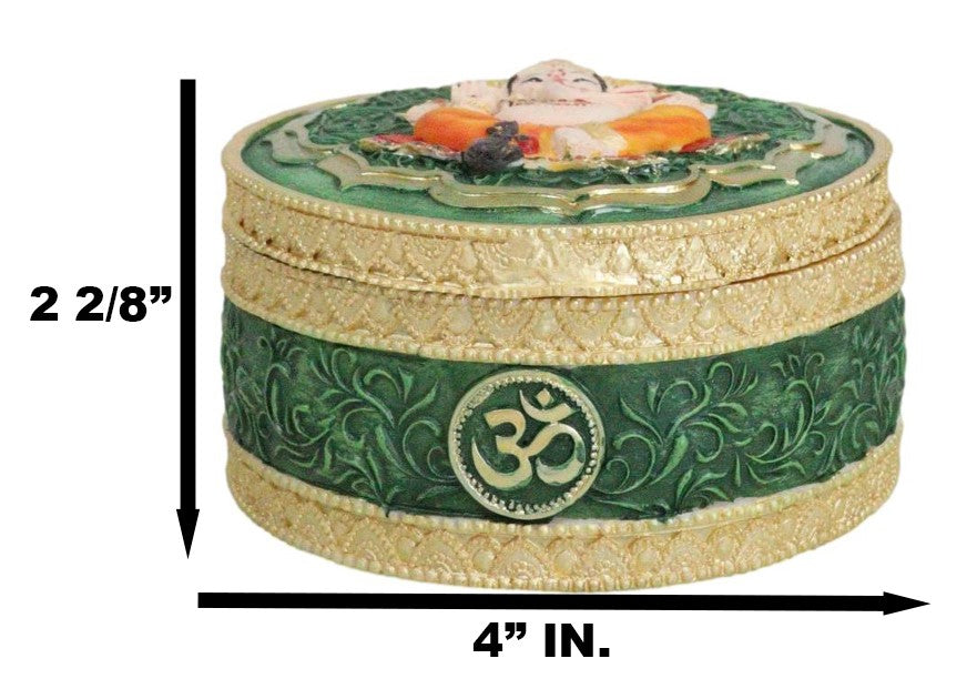 • This Elephant Headed God Ganesha Trinket Box stands at 2.25" tall, 4" wide and 4" deep approximately. It weighs about 10 ounces. • This Elephant Headed God Ganesha Trinket Box is made of high quality polyresin, individually hand crafted and painted. Because each piece is handcrafted, color tone may vary slightly from pictures. • Discover divine elegance with our Ganesha with Mandala Flower and Om Symbol Round Trinket Box. This enchanting trinket box features the revered Hindu deity Ganesha surrounded by intricate mandala flowers and the sacred Om symbol. Crafted with meticulous detail, the round shape adds a touch of sophistication to your storage space. Perfect for keeping your cherished treasures, jewelry, or sacred items, this trinket box combines artistry with spiritual symbolism. • Props and coke can used in the photos are not included with the item. They are meant to provide size perspective of the item.