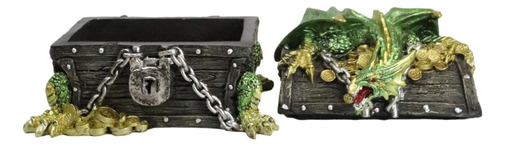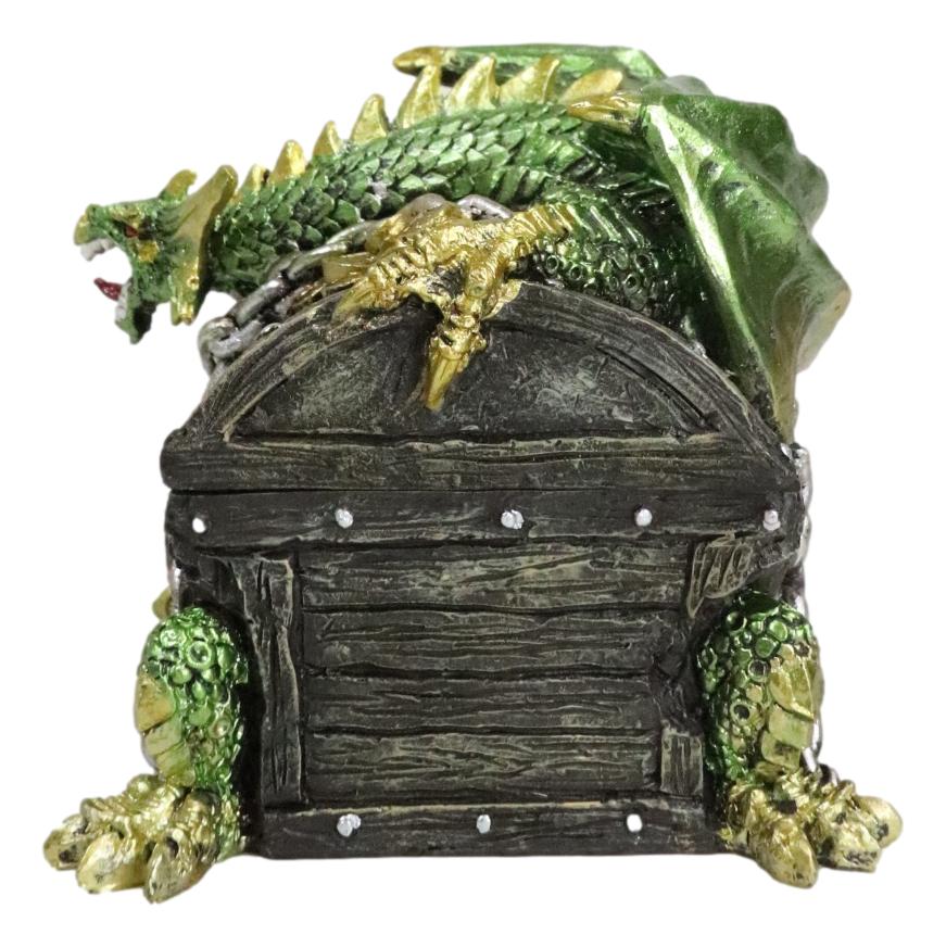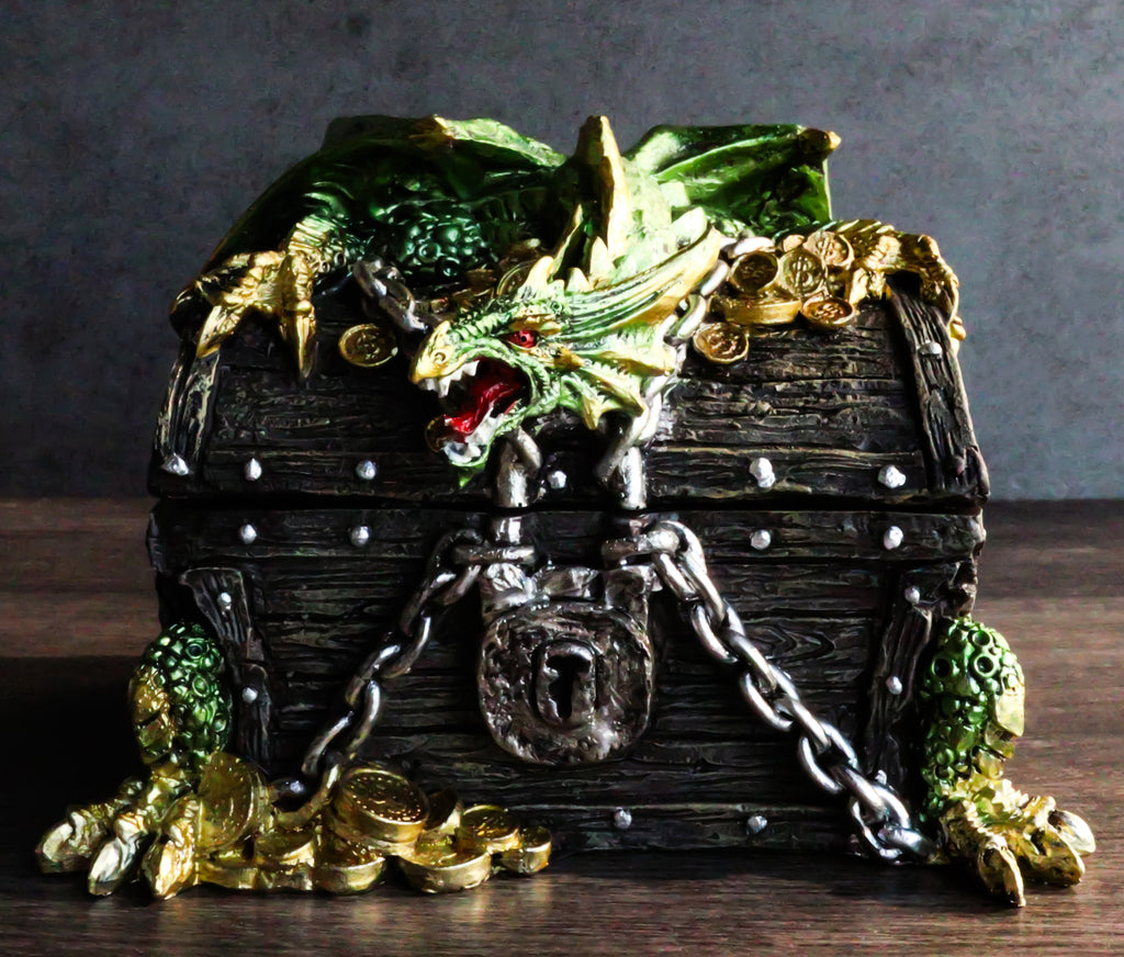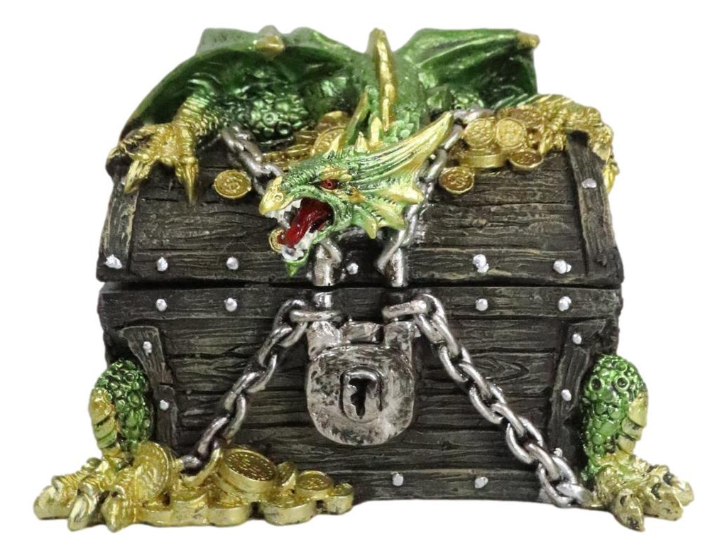 • This is a decorative Dragon themed box for keepsakes, jewelry, and other knick knacks. The fearsome dragon guards a relic treasure chest box with loot and gold coins. This dragon treasure box is definitely an exotic gothic decore for your home or a wonderful gift to fans of dragons, game of thrones, lord of the rings, etc.