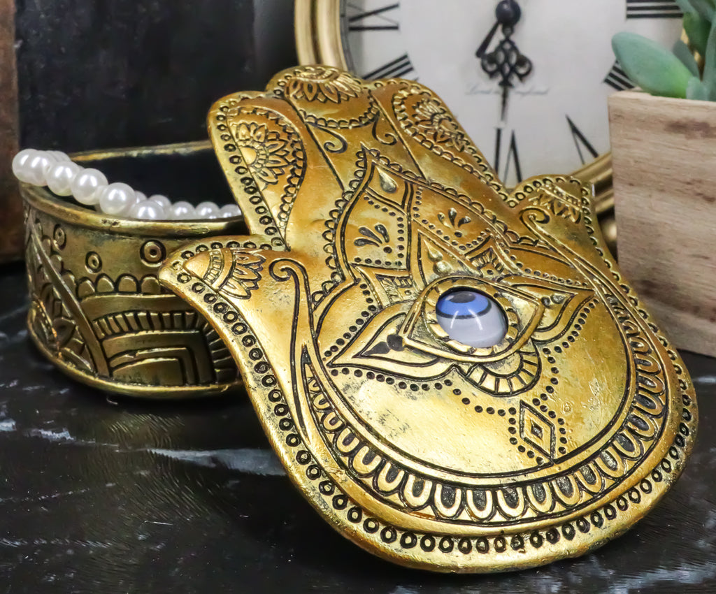 Golden Hamsa Palm Hand Of God With Rolling Evil Eye Decorative Box Figurine