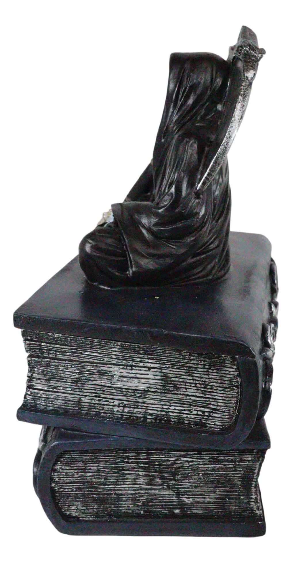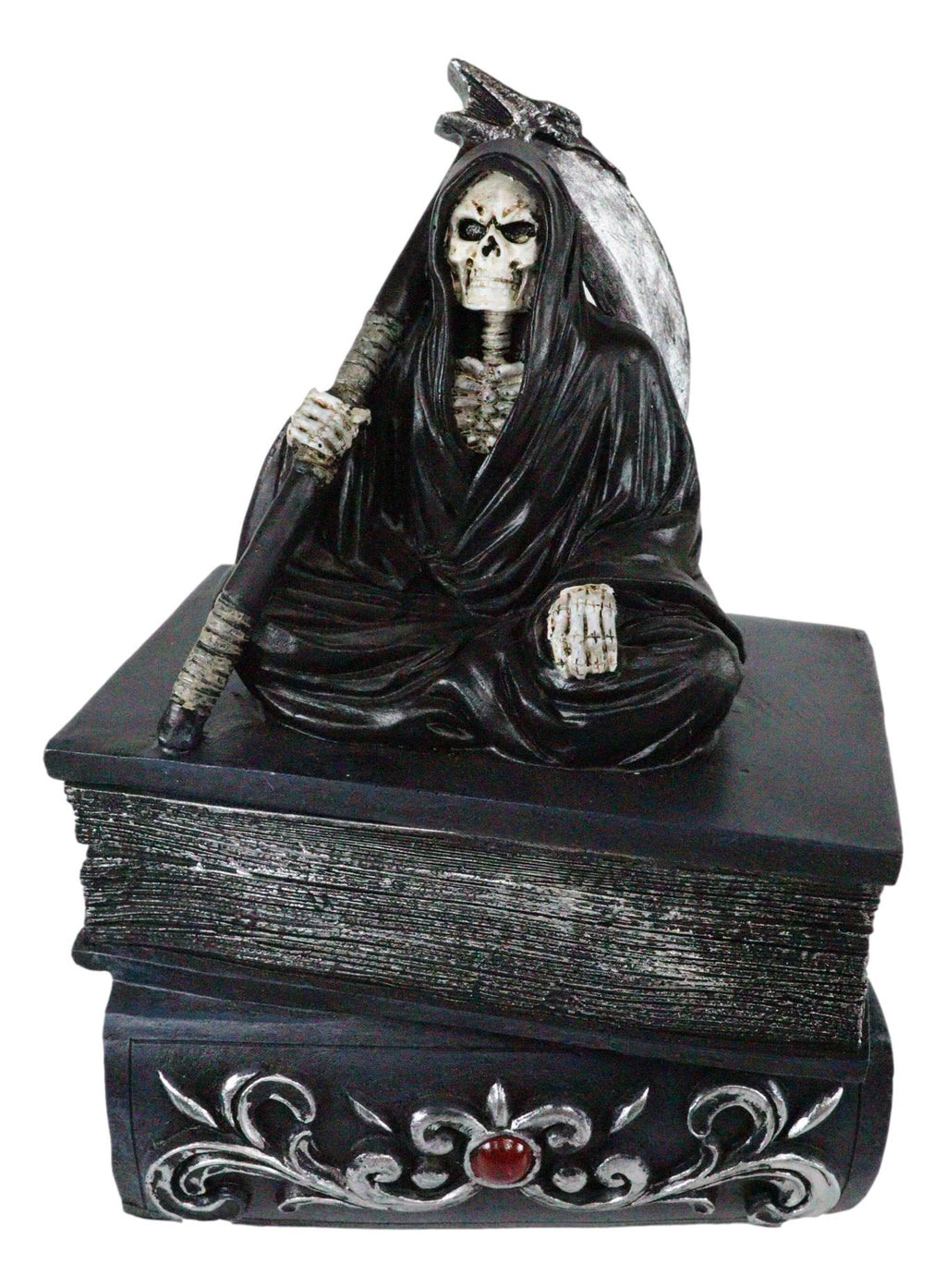 • This Grim Reaper Decorative Box measures approximately 8" tall, 5.5" long and 4.25" wide. The box is 3.25" deep. It weighs about 2.25 pounds. • This Grim Reaper Decorative Box is made of high quality polyresin, hand painted and polished individually. Color tone may vary from pictures. • This is a decorative box for keepsakes, jewelry, and other knick knacks. The iconic death bringer grim reaper sits with his scythe on his shoulder on top of stacked book with scroll art. They are the books of life and if your name is not on it, the Reaper gets to work and your time in this realm ticks away. Jewelry in pictures not included. • Props in photos are not included with the item. They are meant to provide size perspective of the item(s).