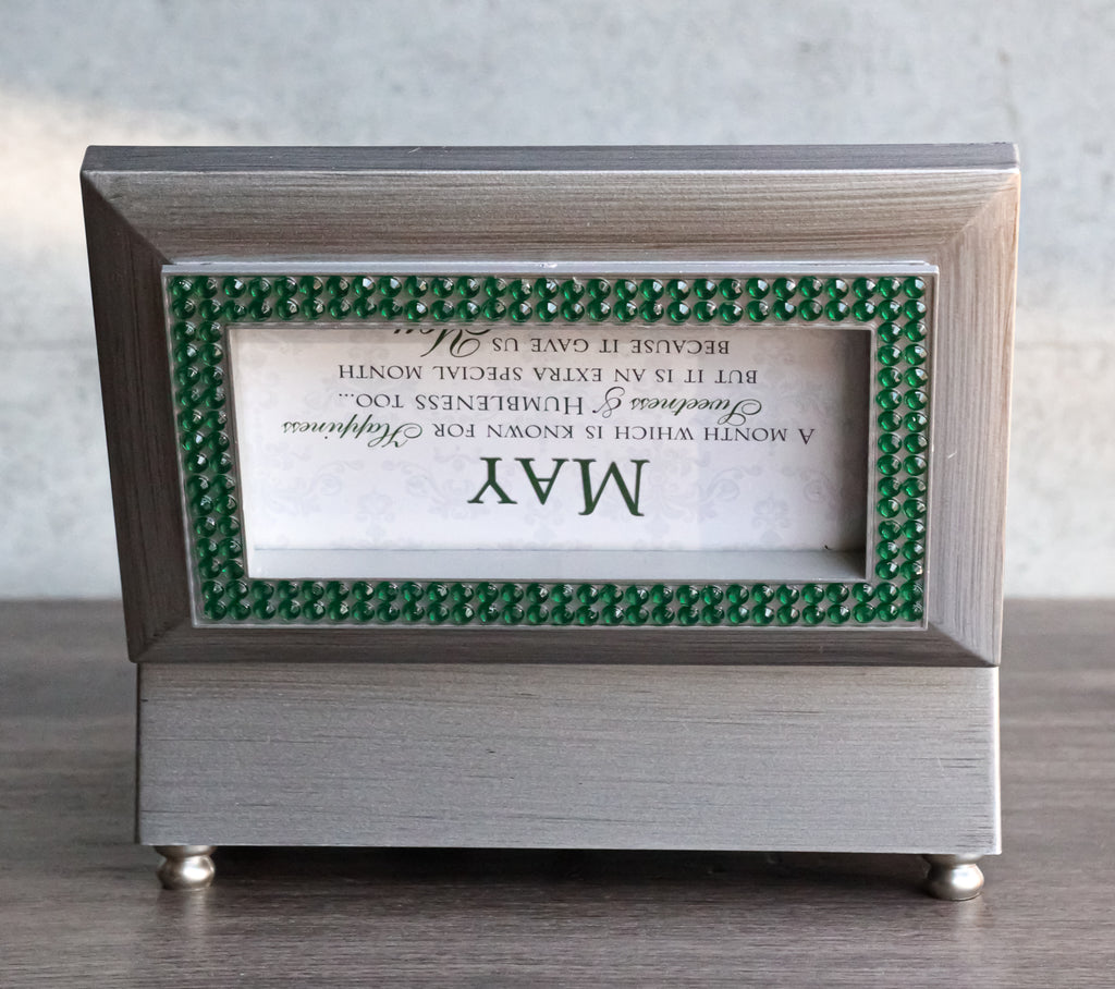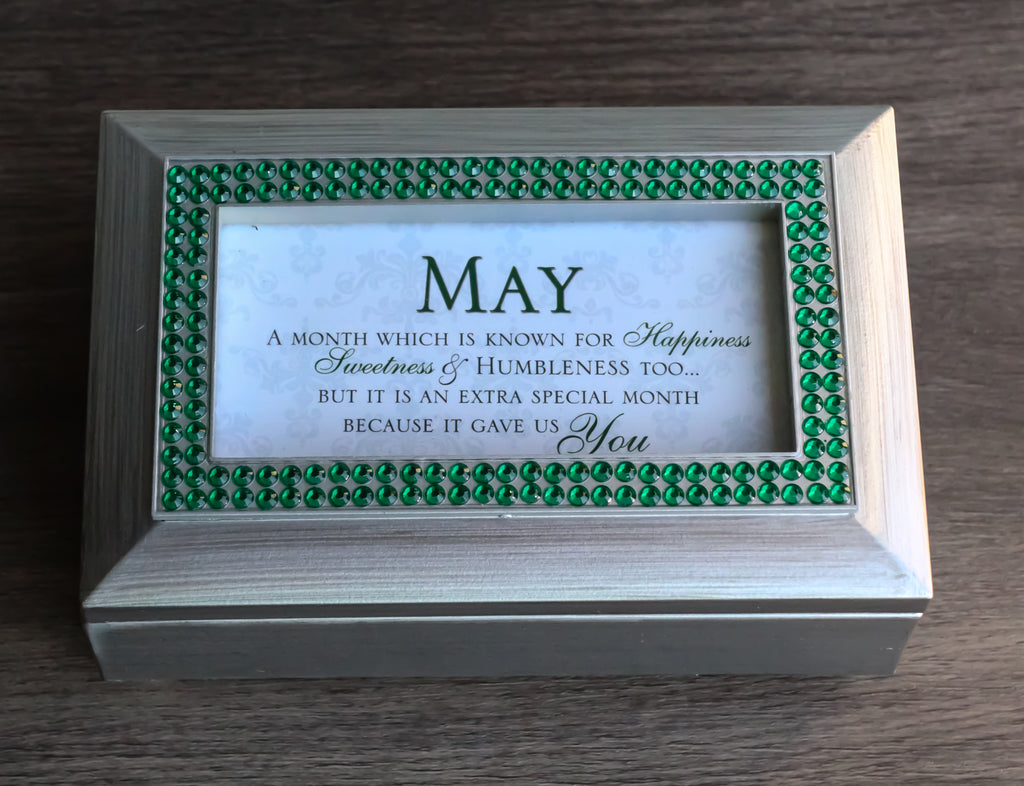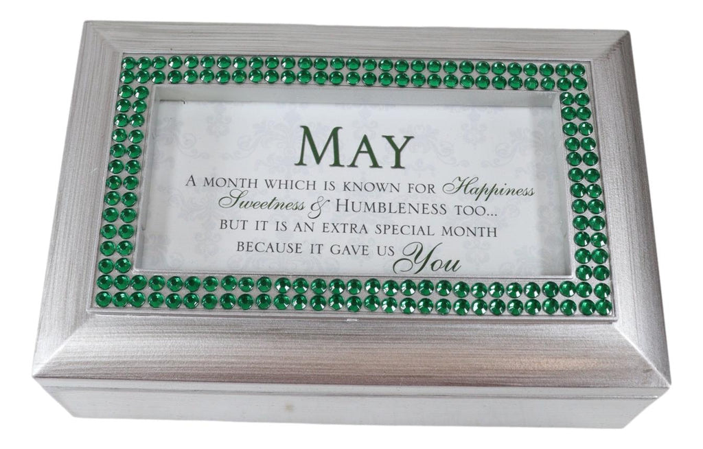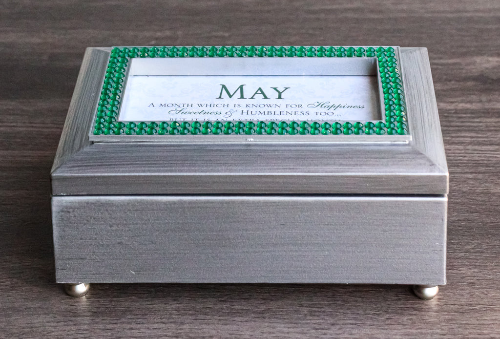 • This Inspirational Birthday Month Musical Trinket Box measures 2.5"H X 6"LX 4"W. It weighs about 13 ounces. • This Inspirational Musical Box is made of high quality polycast and glass. Box is lined with protective rich velvet and padded feet. Comes in nice packaging for easy wrapping. • Beautiful birthstone jeweled photo frame lid and sweet word sentiment art gives this music box a timeless appeal. Brushed silver finish on the exterior. Personalize this box by replacing the sentiment artwork with 4 x 2 inch photo. Traditional wind-up mechanism engages music to play melodic tune You Light Up My Life. Black velvet lined interior compartment cushions your precious treasures; Decorative bun feet are padded to protect furniture surfaces. • This featured box selection is for the month of May, represented by the birthstone Green Emerald. The month of May is known for the virtues of Happiness Sweetness and Humbleness. • Jewelry and props in photos are not included with the item.