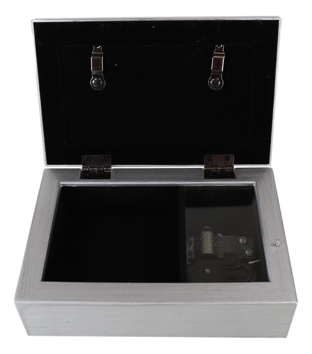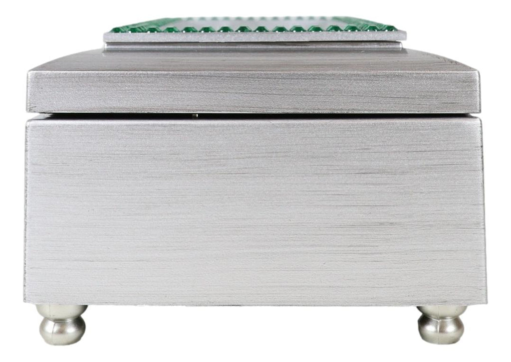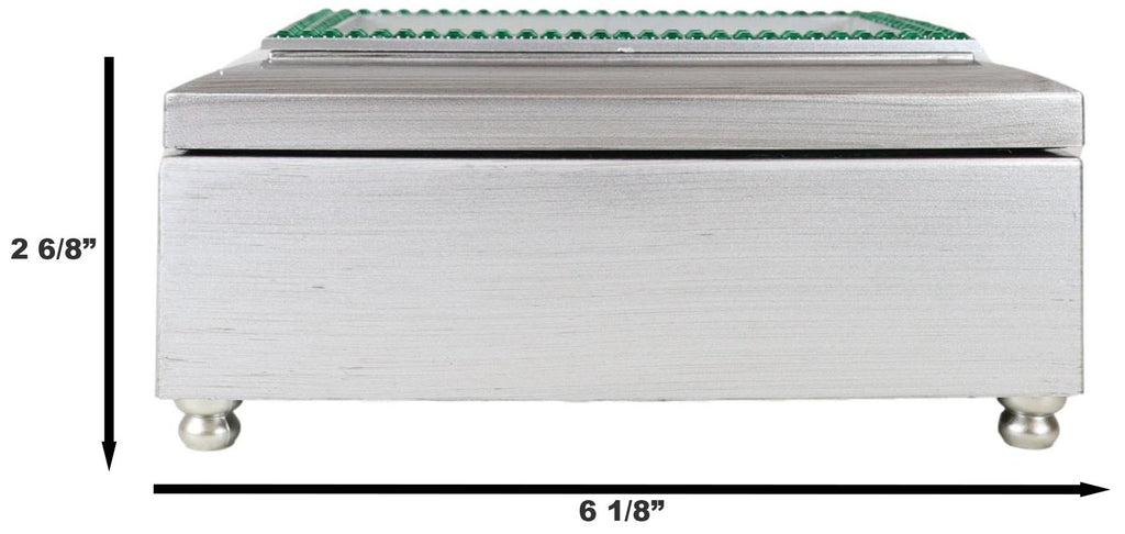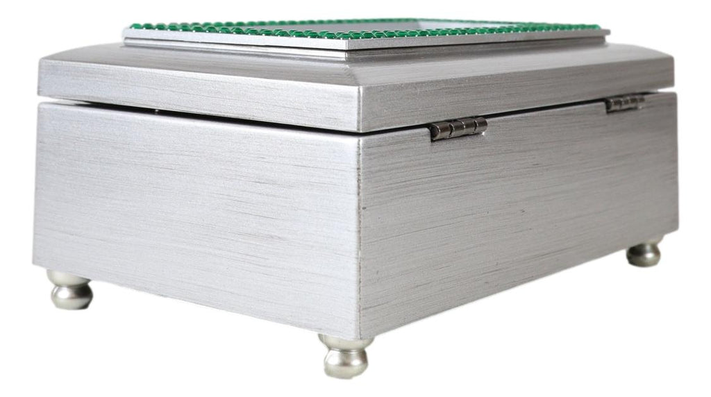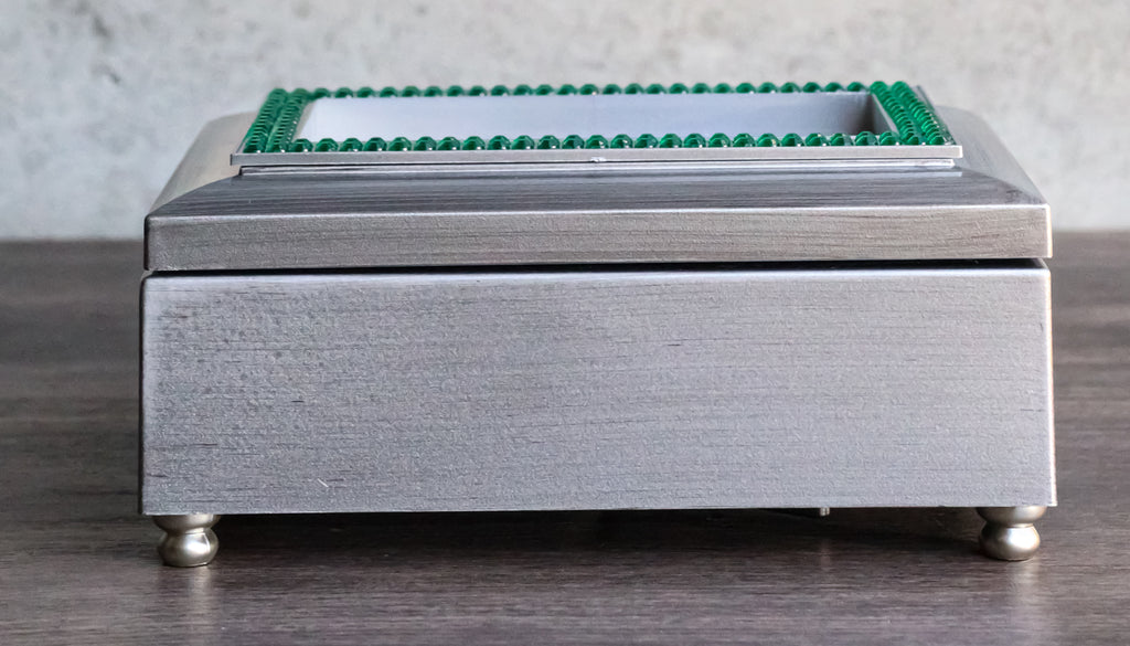 • This Inspirational Birthday Month Musical Trinket Box measures 2.5"H X 6"LX 4"W. It weighs about 13 ounces. • This Inspirational Musical Box is made of high quality polycast and glass. Box is lined with protective rich velvet and padded feet. Comes in nice packaging for easy wrapping. • Beautiful birthstone jeweled photo frame lid and sweet word sentiment art gives this music box a timeless appeal. Brushed silver finish on the exterior. Personalize this box by replacing the sentiment artwork with 4 x 2 inch photo. Traditional wind-up mechanism engages music to play melodic tune You Light Up My Life. Black velvet lined interior compartment cushions your precious treasures; Decorative bun feet are padded to protect furniture surfaces. • This featured box selection is for the month of May, represented by the birthstone Green Emerald. The month of May is known for the virtues of Happiness Sweetness and Humbleness. • Jewelry and props in photos are not included with the item.