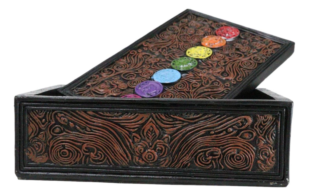 • This metaphysical chakra sculptural tarot card box with lid measures 2.25" High 5.5" Wide and 3.75" Deep. It weighs about 1.5 pounds. • This metaphysical chakra sculptural tarot card box with lid is made of polyresin, hand painted and polished individually. • Tarot card reading is the practice of using tarot cards to gain insight into the past, present or future by formulating a question, then drawing and interpreting cards. Reading tarot cards is a type of cartomancy. A regular tarot deck consists of 78 cards, which can be split into two groups, the major arcana and minor arcana • The box can used for multi purposes. You can use it to keep precious stones, watches, keepsakes, coins, tarot cards, herbs, fengshui items or just a touch of elegance and design to your dressing table or home. • Props, cards and Jewelry in photos are not included with the listing.
