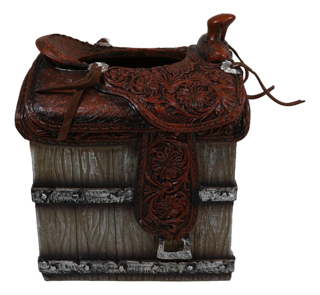 • Western decor is all about spunk and spirit, bringing together the desert beauty of the southwest and all its inhabitants with rugged cowboy charm and rustic good looks. This bathroom accessory showcases a fancy horse saddle with tooled leathering over a country wooden crate.