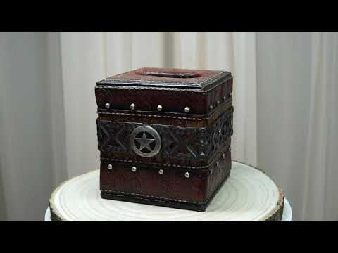 • Serve your napkins or tissue with a dash of rustic glamour with this floral tooled leather tissue box cover holder. The sculptural design features Western Star, cross fences encircling the tissue box, silver nailheads, faux tooled leather surface with stitch-marks for realism and more!