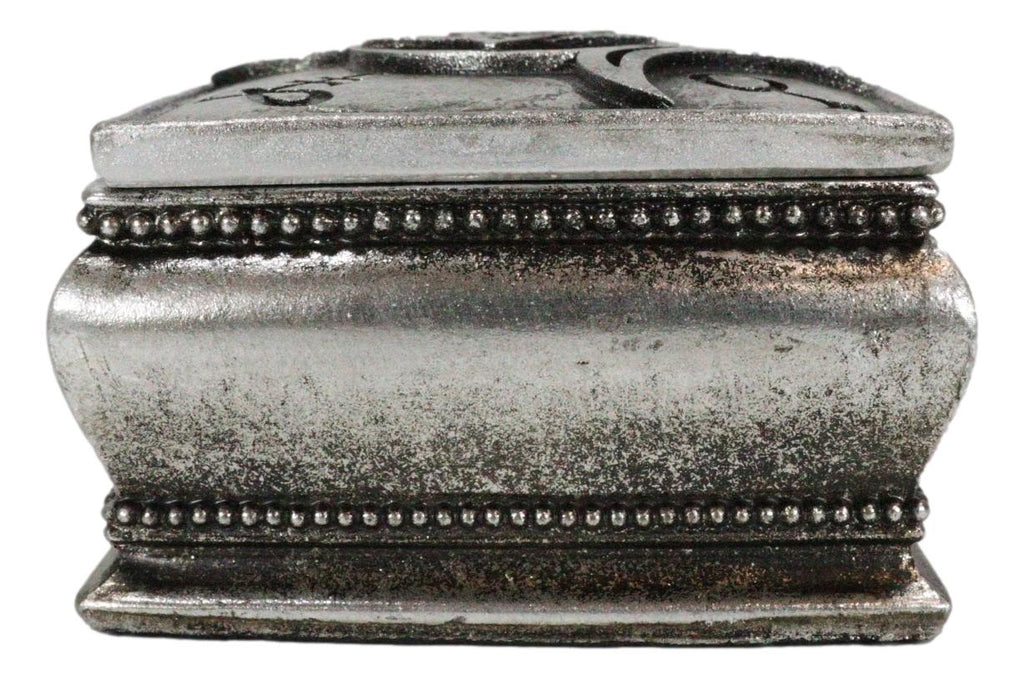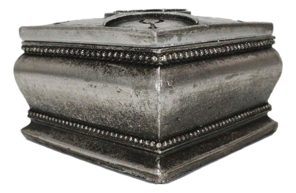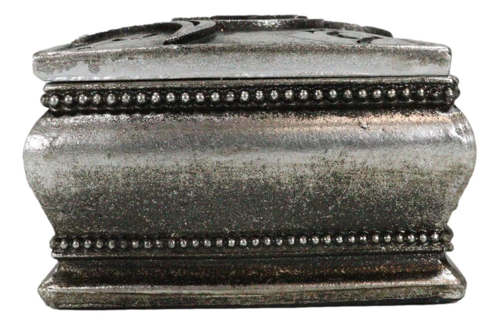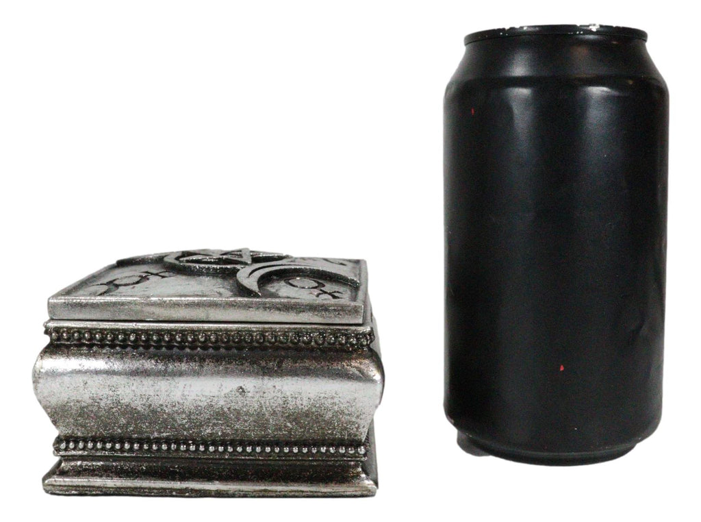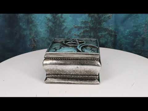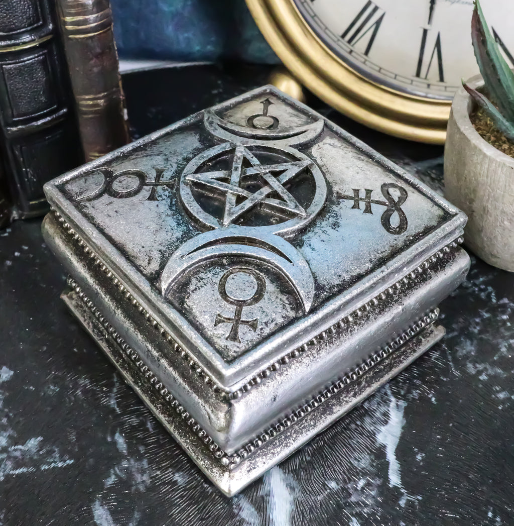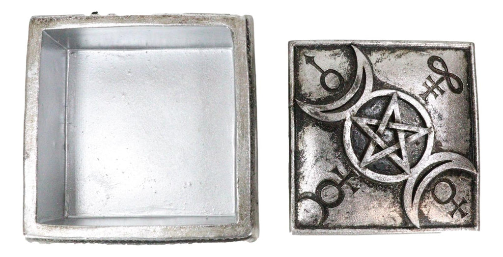 • Perhaps you need a place to hold your magical treasures or alchemical trinkets away from prying eyes. This silver-colored trinket box has an antique finish. Also, it has a square shape. Its lid comes completely off the box. On the lid, there is a triple moon symbol in the center with the crescent moons facing opposite corners of the lid. In the center of the full moon, there is a pentacle. At each corner of the lid, there is a black alchemical symbol.
