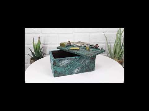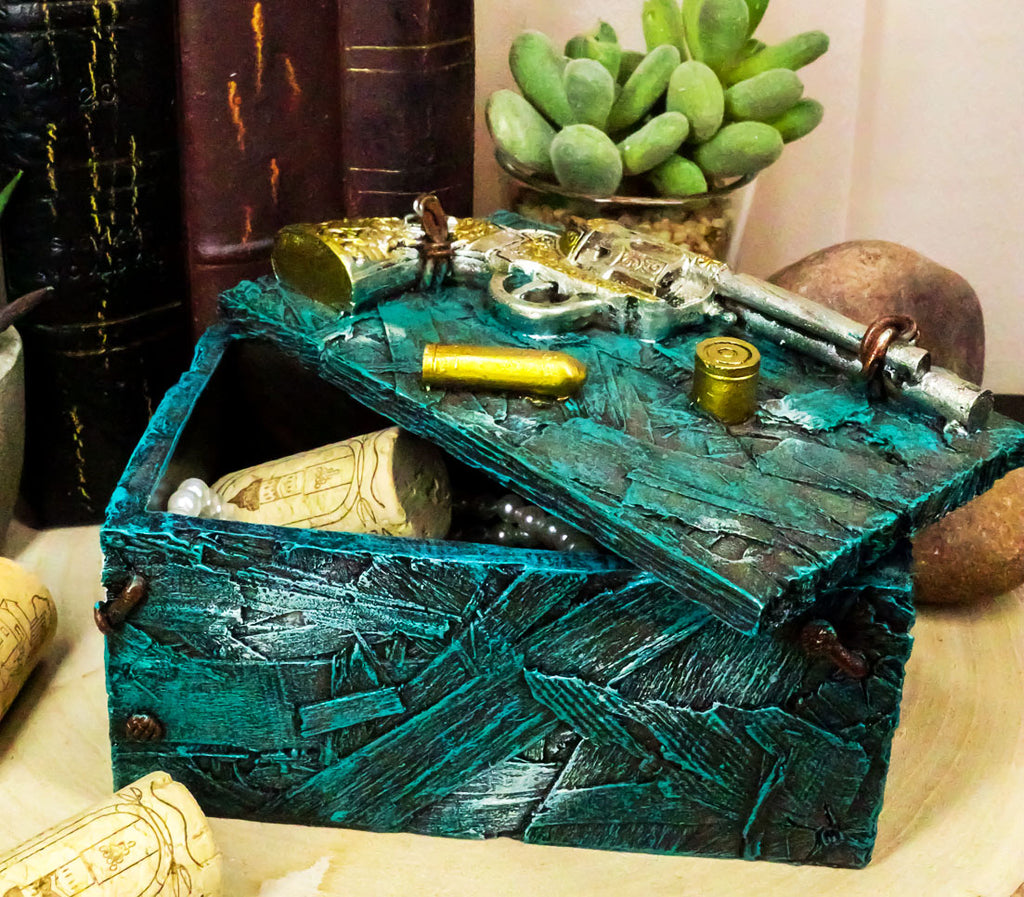• Add a touch of old world western grit to your home or office setup with this revolver gun and bullets decorative box sculpture. The box base is green in color and is designed like a rugged wooden crate. You can store your favorite stash, select stationery, jewelry and more inside this keepsake box.