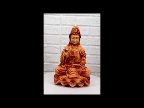 • This Benevolent Water And Moon Goddess Kuan Yin Bodhisattva Statue is made of designer composite resin, hand painted and polished individually to resemble wood..