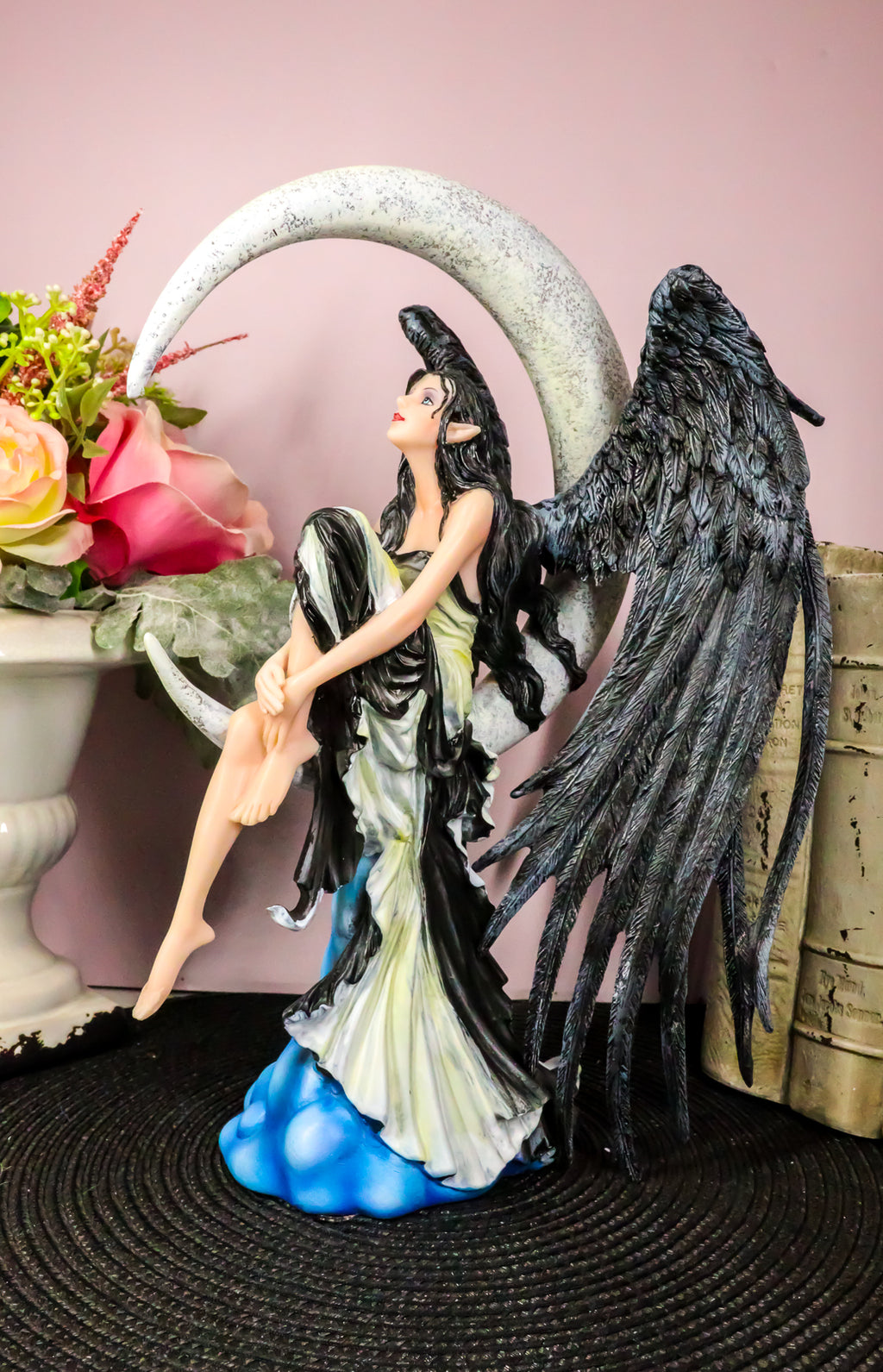 • This absolutely beautiful sculpture is based upon the artwork of Nene Thomas! The fae has black feathered angel wings and sits perched upon the crescent moon, staring up deeper into the heavens. With ebony hair and a dress in dark and ivory, she's a captivating sight!