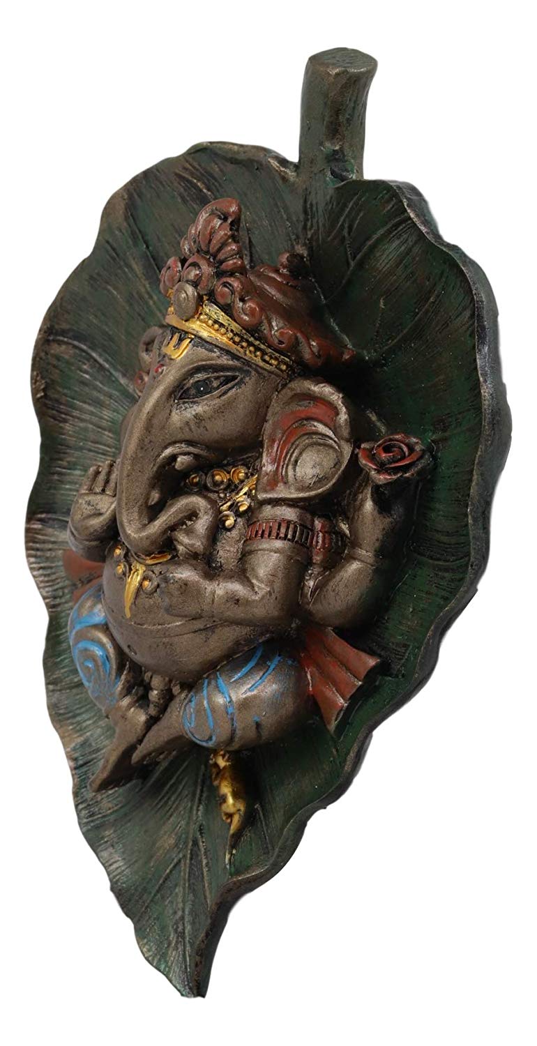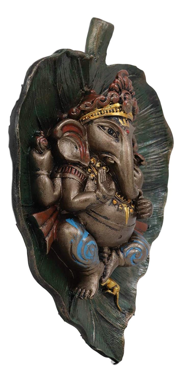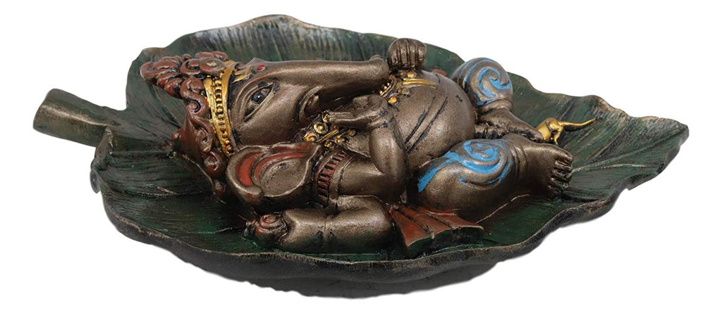 This Ganesha Sleeping On Peepal Leaf Statue is made of designer composite resin, hand painted and polished individually. Color Tone may vary
