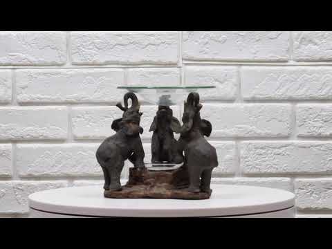 • This Trio Trumpeting Elephants Oil warmer is made of designer composite resin, hand painted and polished individually. Color tone may vary from pictures. Glass Dish and One Standard Tea Light Candle is included. Oil/Tart not included.
