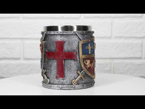 • No matter what you are drinking, the final ingredient should always be a medieval drinkware, because everything tastes better when it is sipped in medieval style. This stylish drinkware features many medieval/renaissance elements revolving around Kings and Knights. You will see a coat of arms heraldry symbol consisting of the felur de lis, brave king lion, a shield crest, crossed swords and more! The drinkware is hand painted in striking colors of royalty and knighthood.