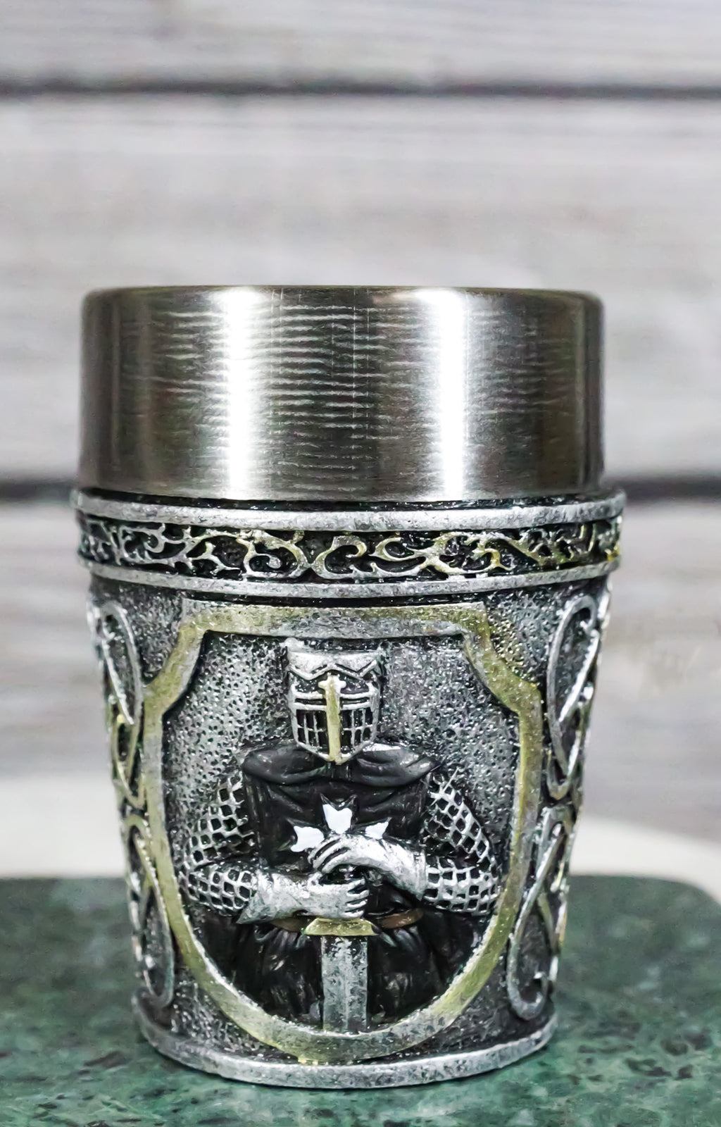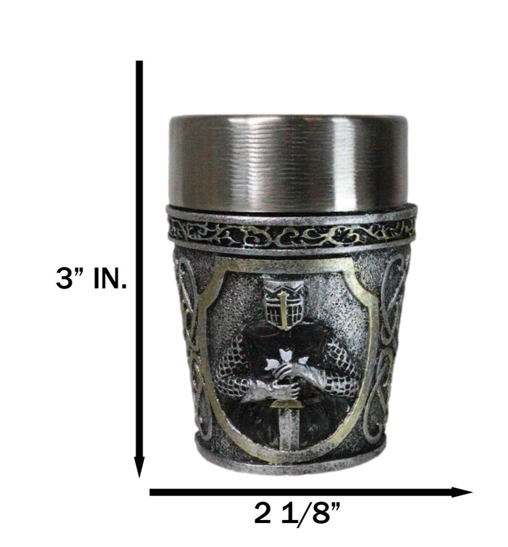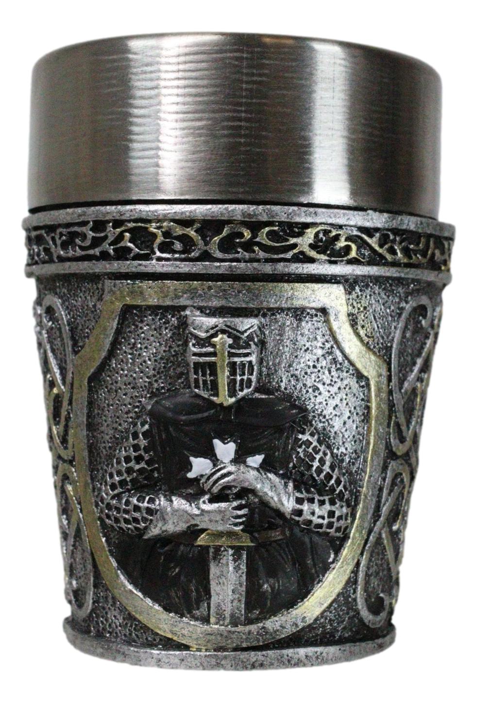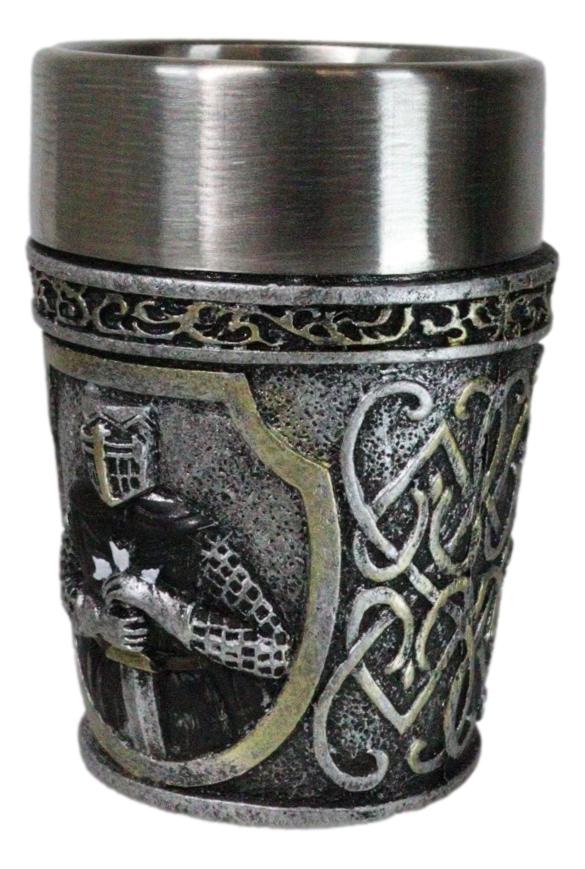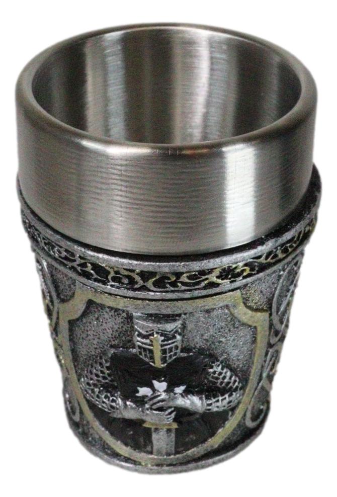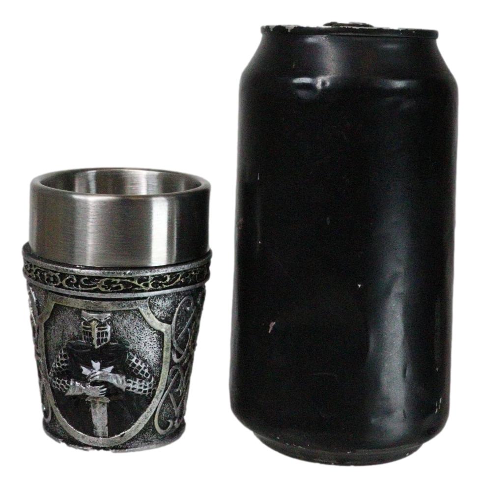 • Each of these Medieval Crusader Knight shot glasses is 3" tall, 2.25" wide and 2.25" deep approximately. It holds 3 fluid ounces. • Each of these Medieval Crusader Knight shot glasses are made of polyresin with stainless steel inner cup liner. The sculptural housing is hand painted and polished. • Raise a toast to history with our Scroll Patterned Medieval Templar Crusader Knight Resin Shot Glass! Featuring an intricately designed exterior that showcases the noble heraldry of the Templars in a Caped Crusader Knight, this shot glass combines a striking medieval aesthetic with modern functionality. The durable resin body is complemented by a stainless steel inner cup liner. Perfect for collectors, themed parties, or as a unique gift. • This listing is for 4 shot glasses as pictured. Props in photos are not included with the shot glasses.