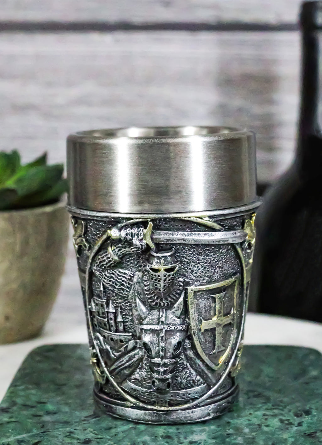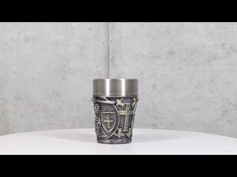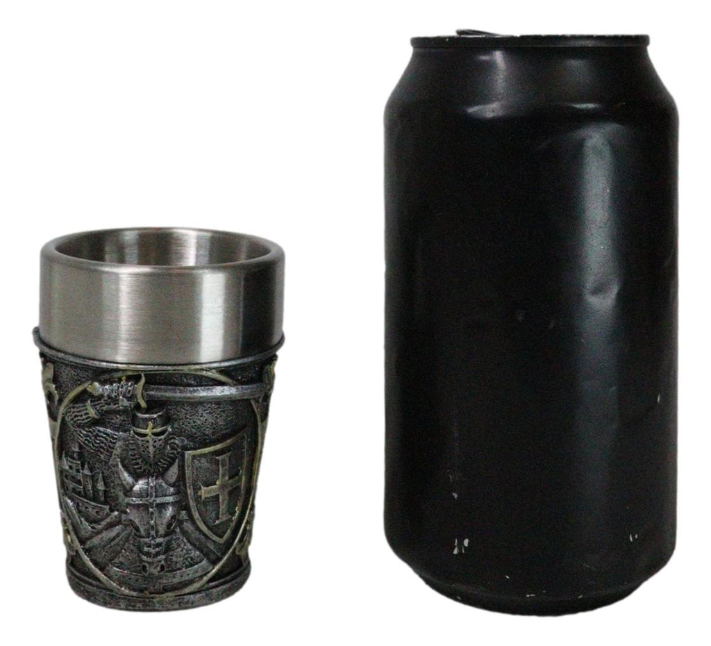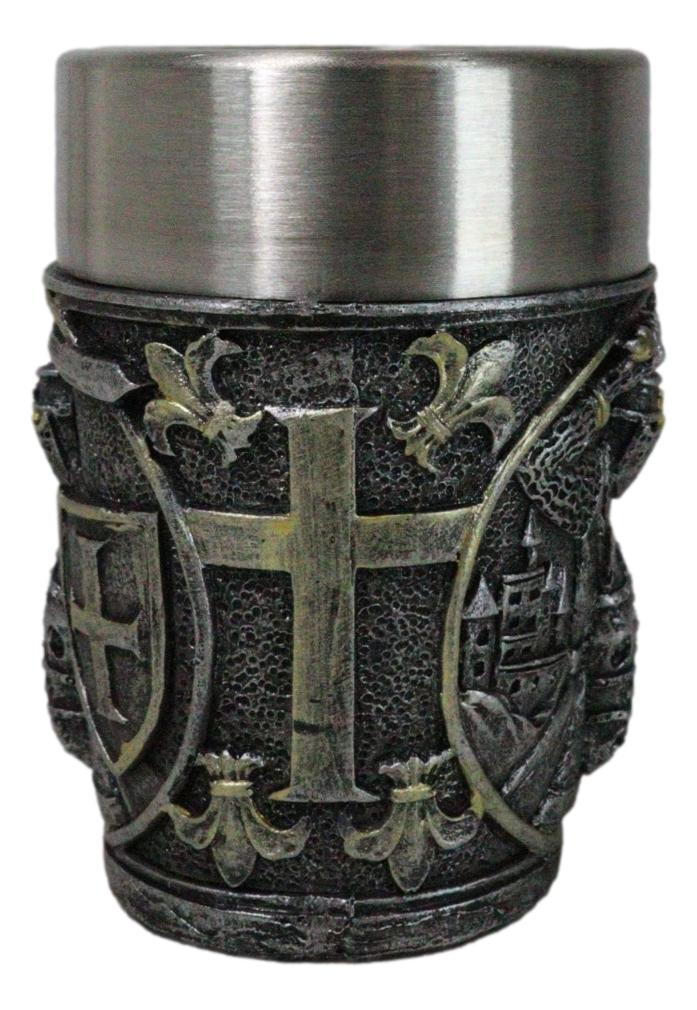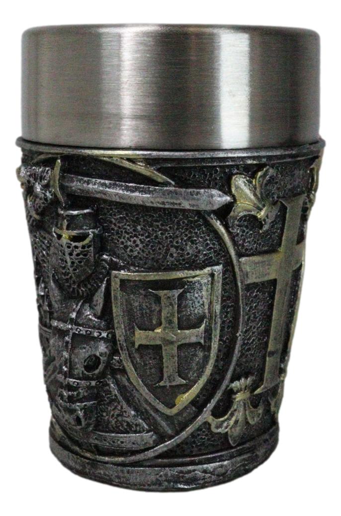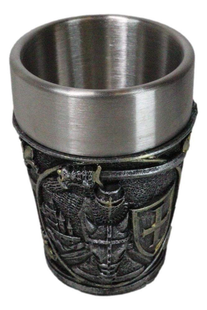 • Each of these Medieval Crusader Knight shot glasses is 3" tall, 2.25" wide and 2.25" deep approximately. It holds 3 fluid ounces. • Each of these Medieval Crusader Knight shot glasses are made of polyresin with stainless steel inner cup liner. The sculptural housing is hand painted and polished. • Raise a toast to history with our Medieval Templar Crusader Knight On Horse Resin Shot Glass! Featuring an intricately designed exterior that showcases the noble heraldry of the Templars in a Caped Crusader Knight, this shot glass combines a striking medieval aesthetic with modern functionality. The durable resin body is complemented by a stainless steel inner cup liner. Perfect for collectors, themed parties, or as a unique gift. • This listing is for 4 shot glasses as pictured. Props in photos are not included with the shot glasses.