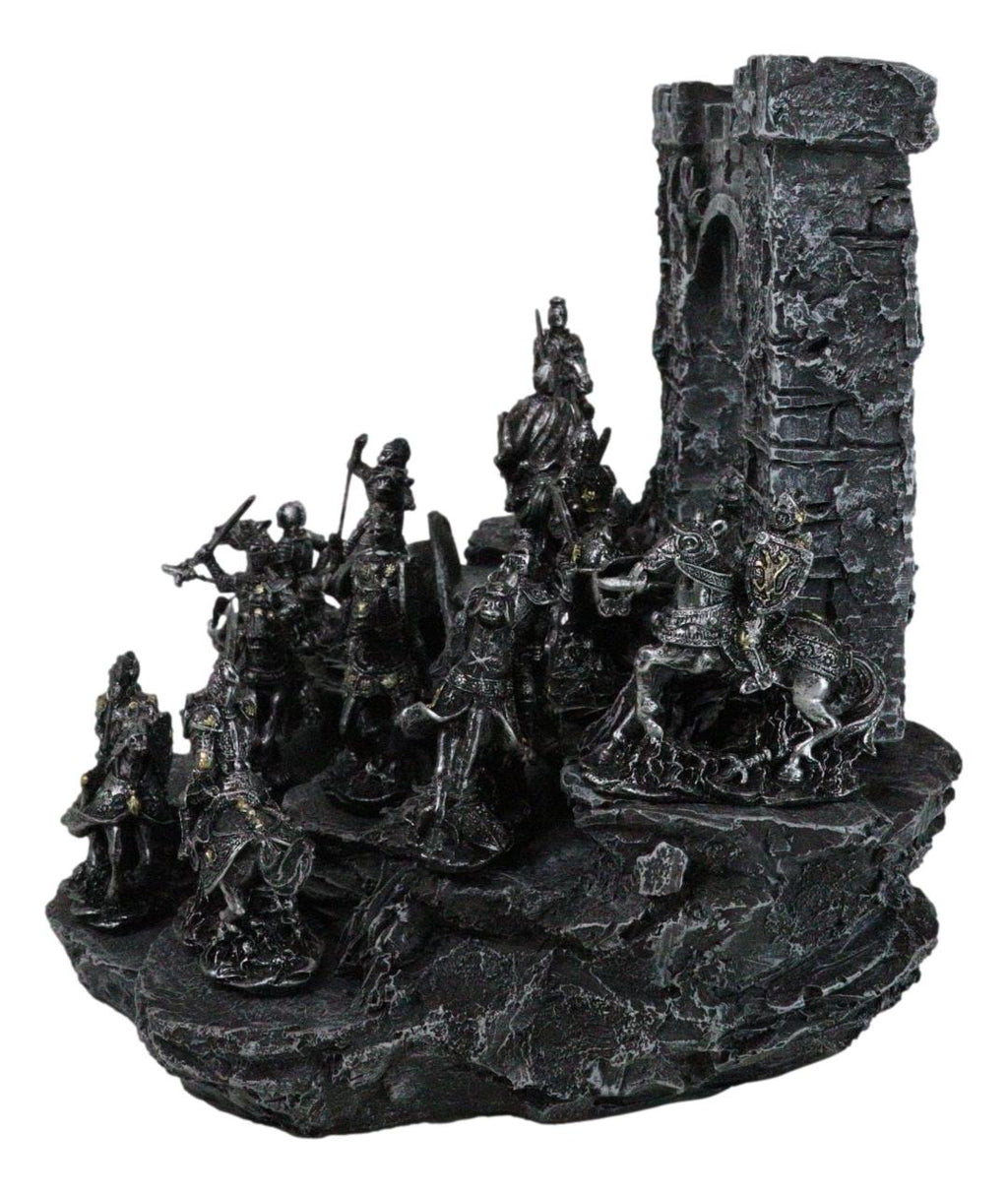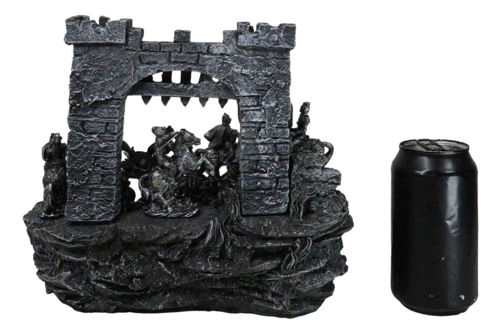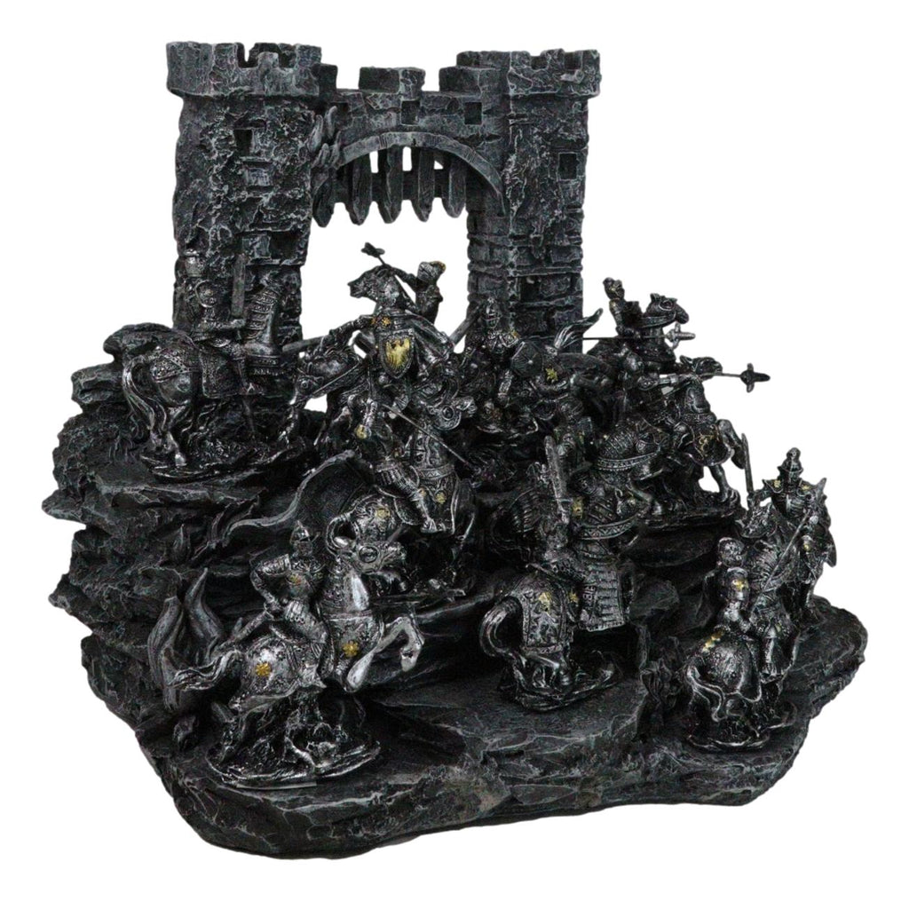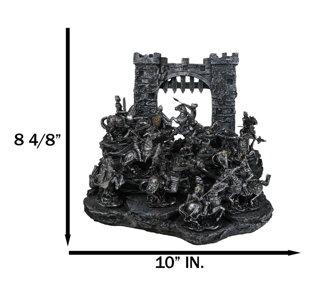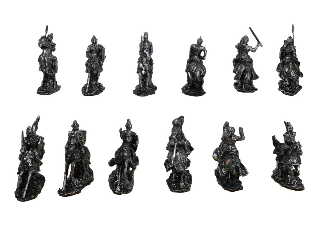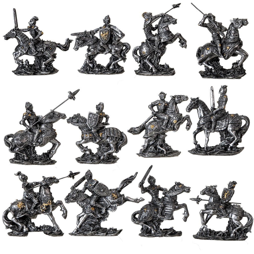 • This stunning set of 12 miniature knights on horses with drawbridge castle display stand are made of polyresin, hand painted and polished individually. • This stunning set of 12 miniature knights each measures approximately 2.25"-3" tall, 2.5"-3" wide and 1" deep. The set weighs about 1 pound. The drawbridge castle display stand measures 8.5" High, 10" Long and 8" Deep. • Transform your tabletop with the stunning Medieval Castle Drawbridge accompanied by a Set of 12 Mini Armored Cavalry Horse Knights. This captivating scene captures the essence of medieval grandeur, featuring intricately detailed knights in full armor, ready to charge into battle. The drawbridge adds a dramatic focal point, bringing a sense of history and adventure to your collection. Perfect for enthusiasts and collectors alike. • This listing is for 12 miniature knight figurines as pictured. They fit into our various castle display stands sold separately.