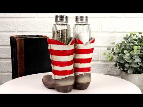 • Some boots were made for walking, but this patriotic american flag salt and pepper shaker set brings a nationalistic pride to your kitchen in the land of the free. A welcome Christmas gift for that servicemen/women or patriots on your shopping list, or for any collector of country western home décor. Three piece set includes one decorative holder display figurine and two glass salt & pepper shakers.