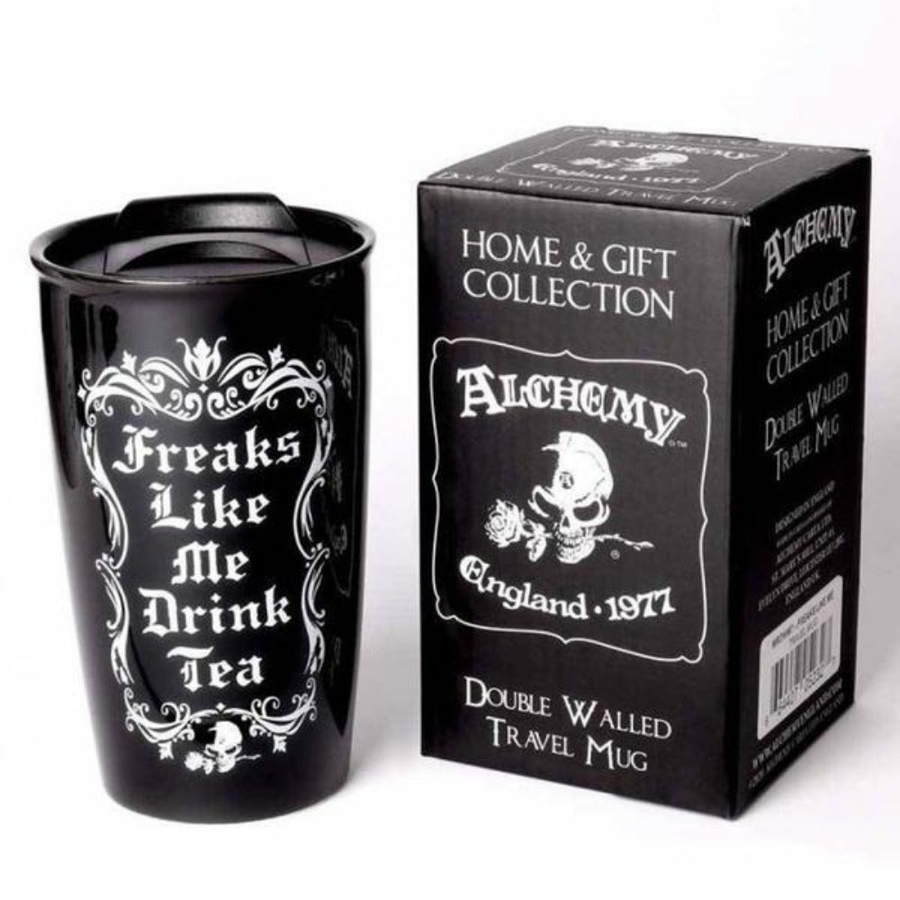 • These incredible travel mugs actually work! Made from the highest quality ceramic material and double walled to insulate. These travel mugs keep your drinks hot or cold for longer than you will believe. Show the world your own unique style when on the go! Design features scroll art with the words 'Freaks Like Me Drink Tea' in the center.