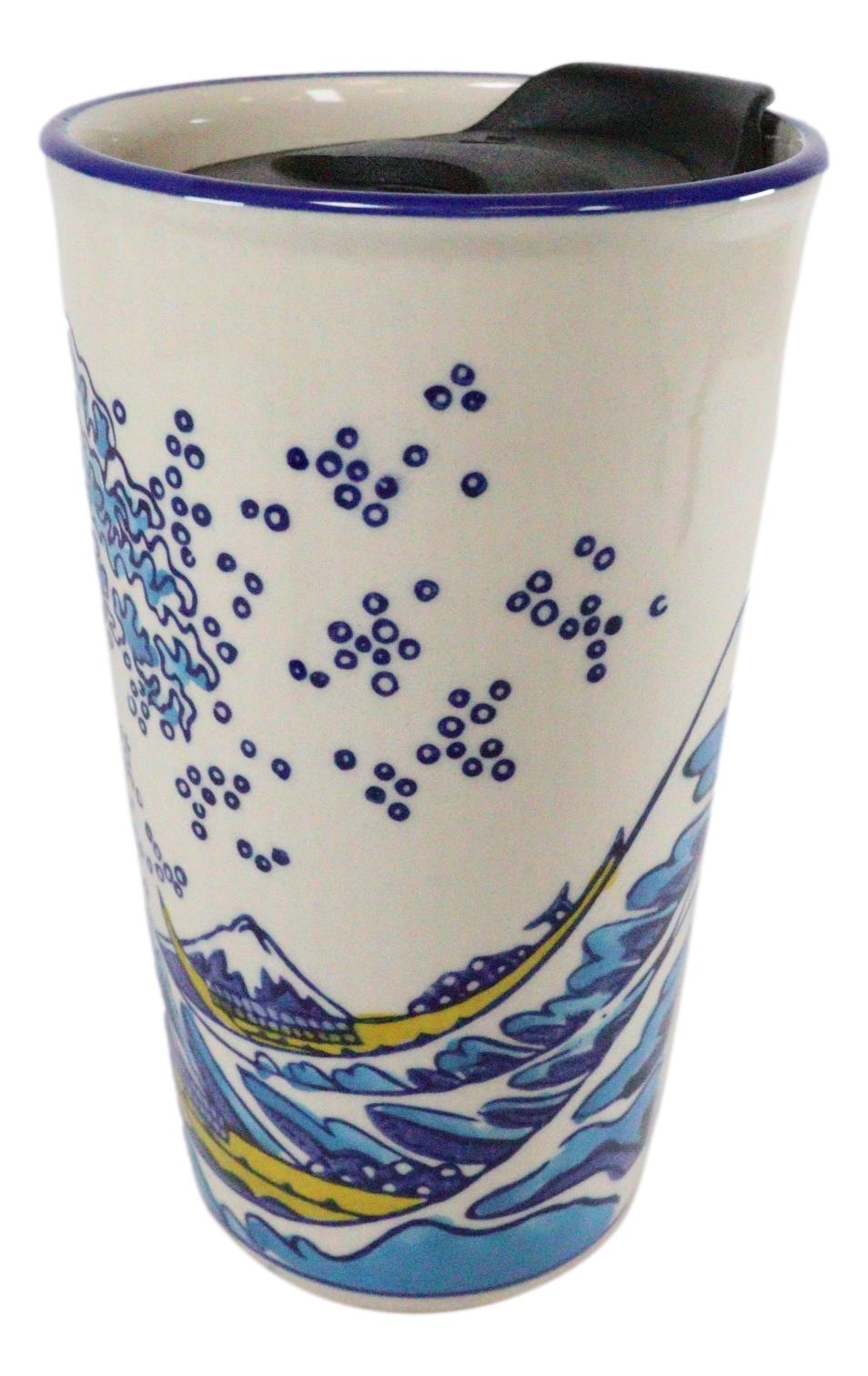 Ebros Hokusai Great Wave Mount Fuji Ceramic Travel Mug Cup 14oz With Lid