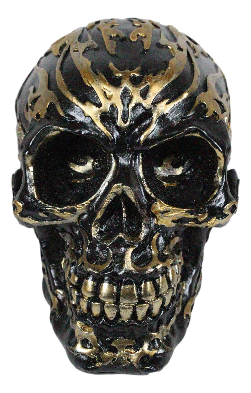 • This Black And Gold Tribal Skull sculpture is made of high quality polyresin. It is meticulously hand painted and polished. Color tone may vary from pictures.