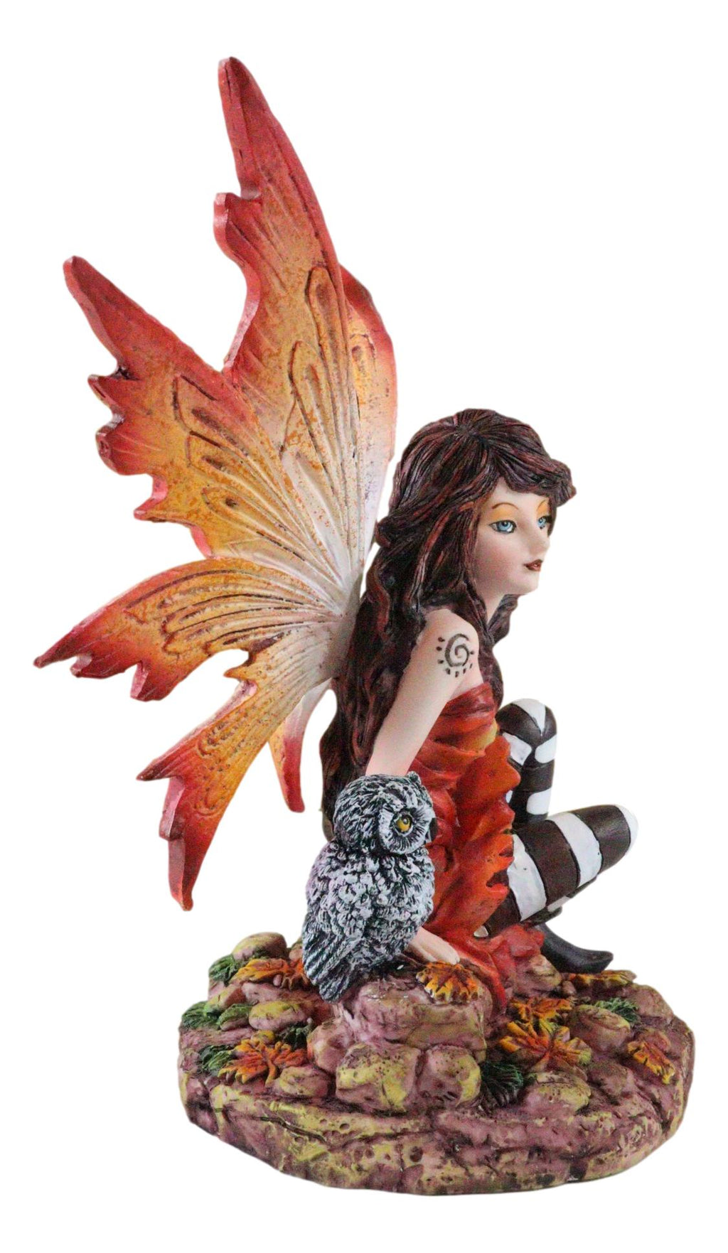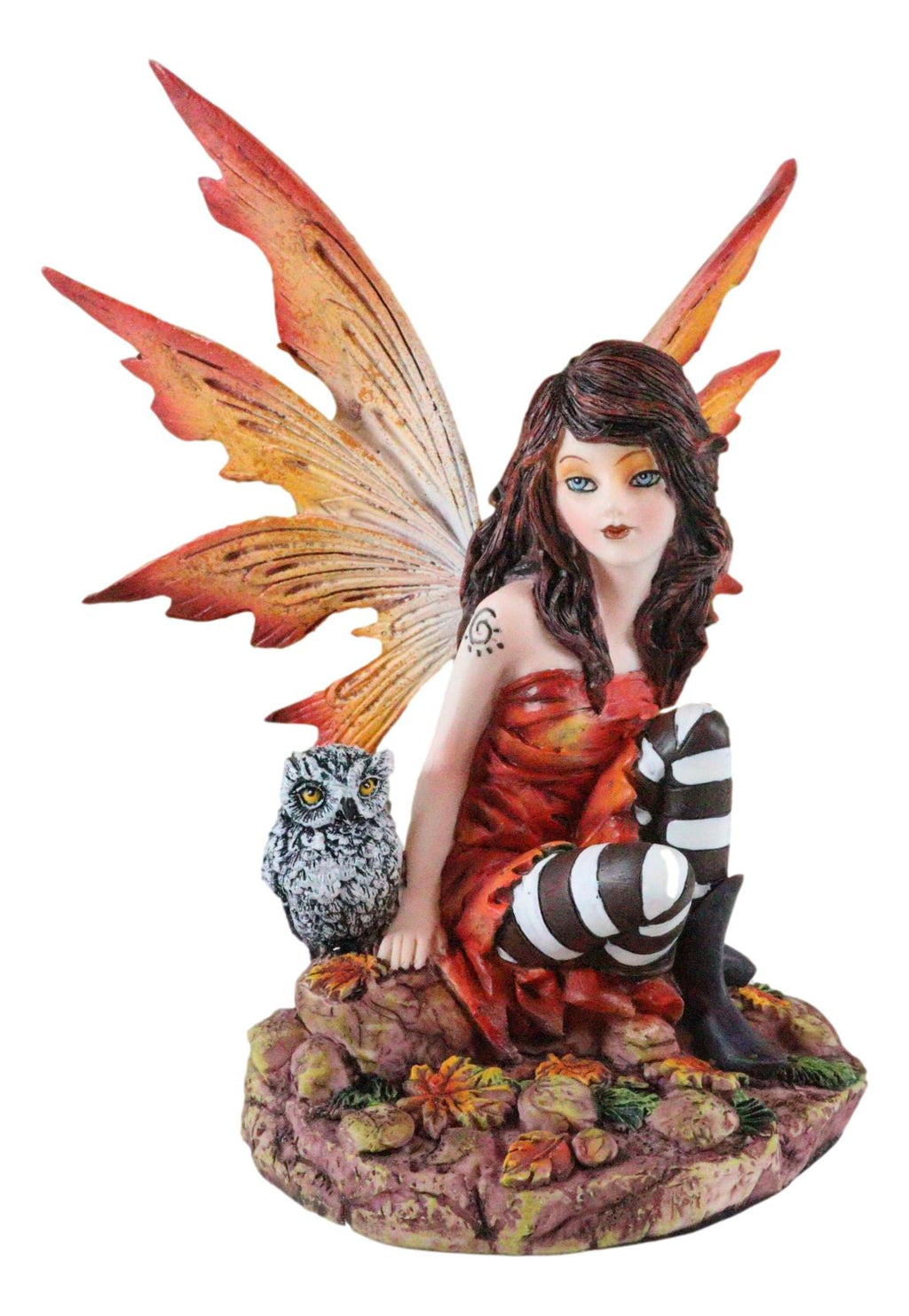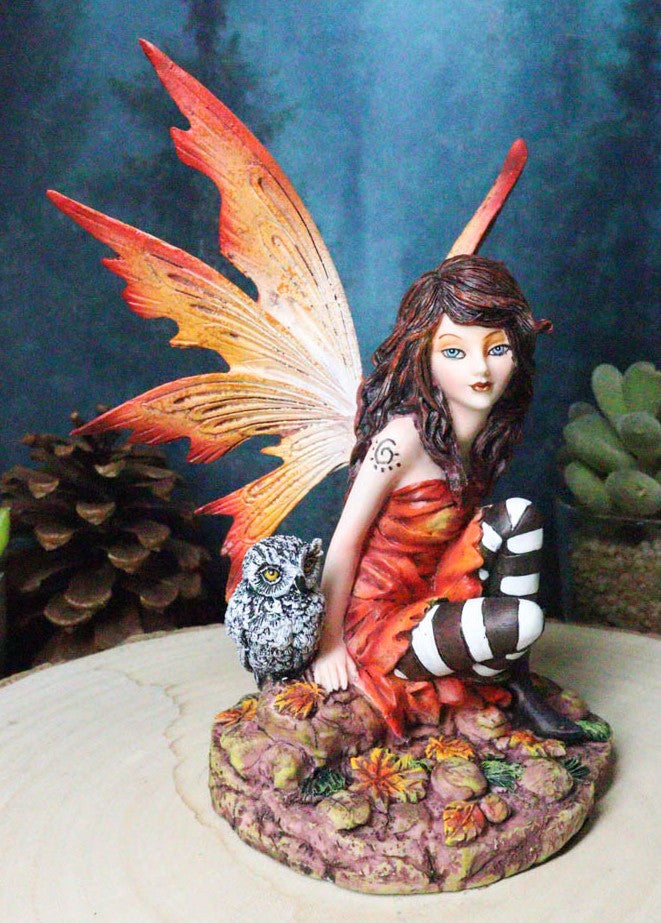 • A beautiful brunette fairy with orange wings sits by her baby owlet on the forest rocky grounds. Autumn leaves fall sporadically on the floor. The beautiful fairy is dressed in orange gown and striped stockings with brown boots. The sculpture will bring a cozy, warm, halloween, fall festive feel to your room wherever you display it.