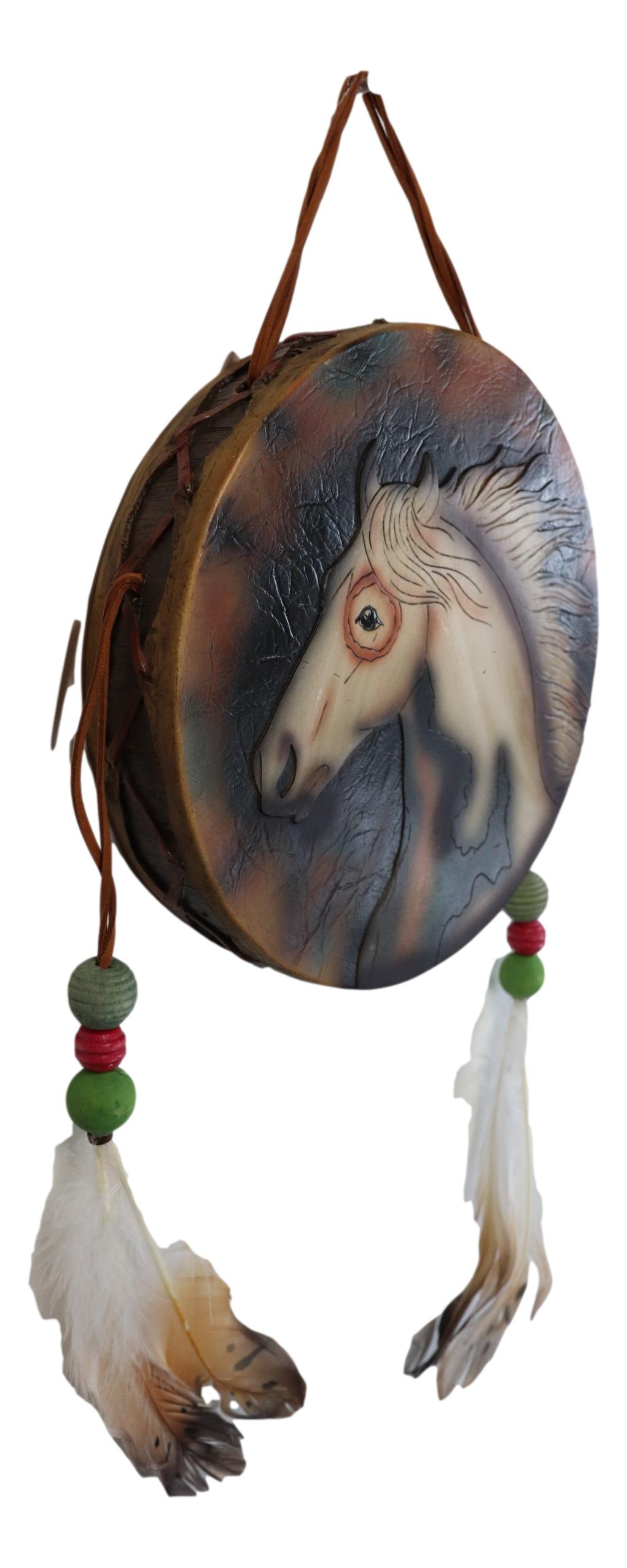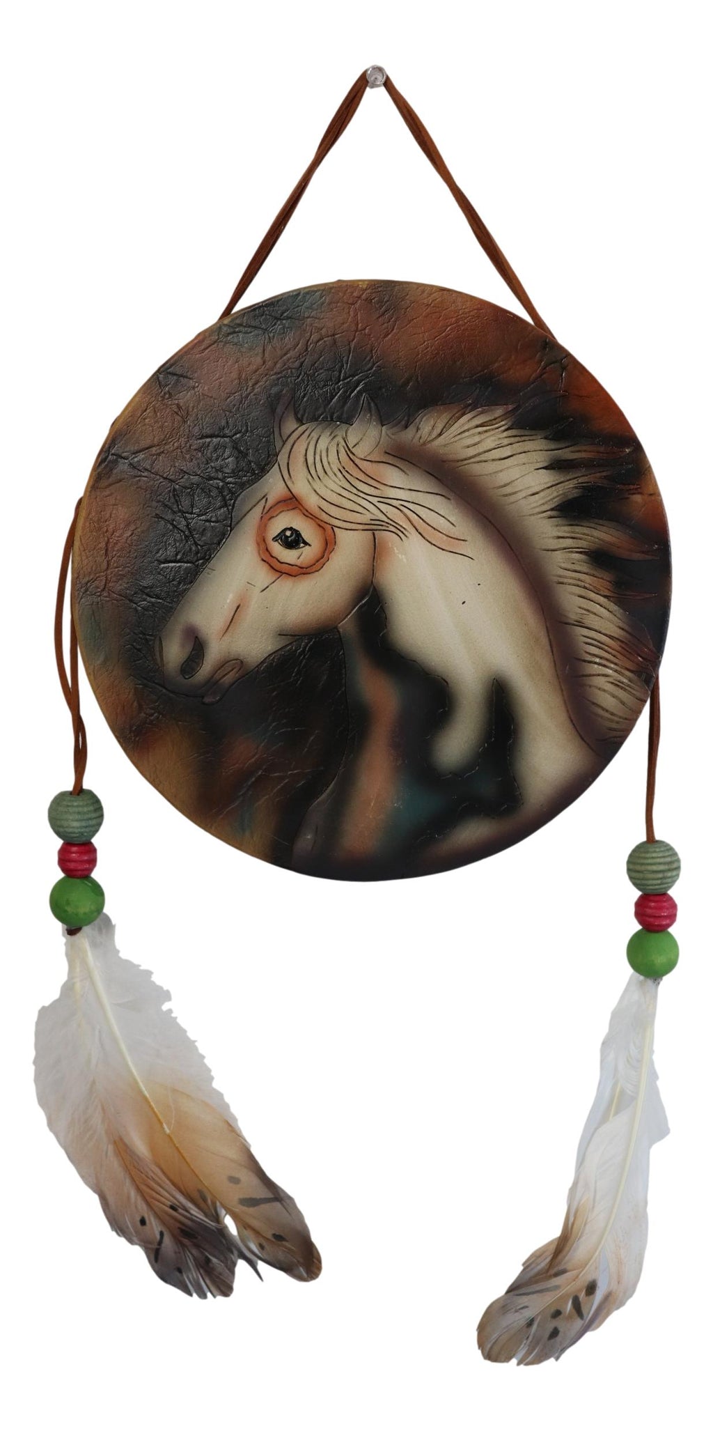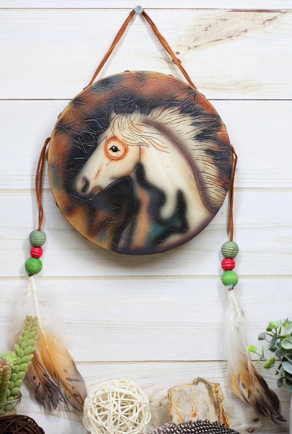 • This Dream Catcher Themed Wall Decor plaque features two beaded feathers dropping down the sides. In the center is a round plaque finished like the warpath drum, engraved and painted with an image of a white medicine horse.