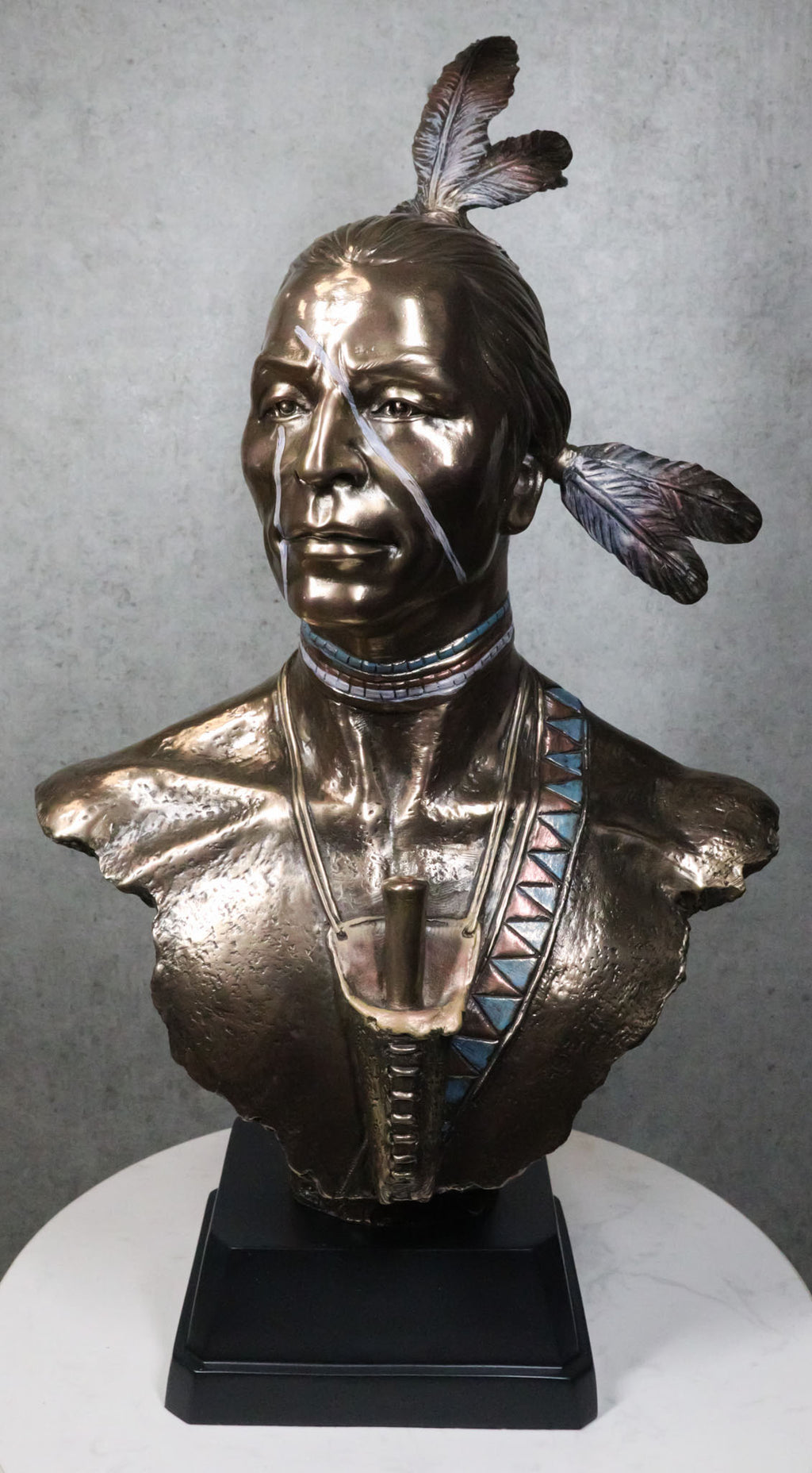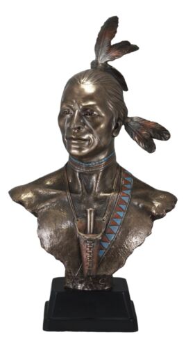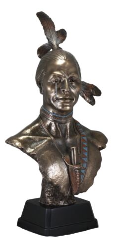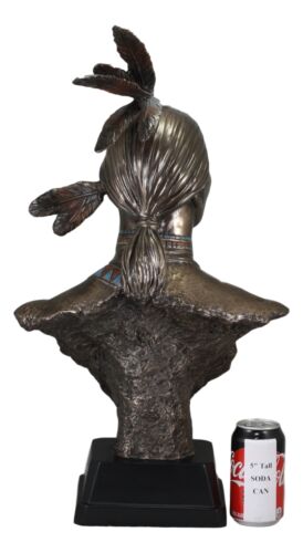 • This high-end detailed sculpture is a wonderful replica of a Native American Indian warrior. Cast in museum-quality designer resin, this Native American Warrior statue is meticulously hand-painted in a natural and faux bronze palette to highlight every nuance from his weathered skin to warrior pulled back hair and feathers of rank. The bust is masterfully set on a black woodlike pedestal base to finish off a high end museum like look.