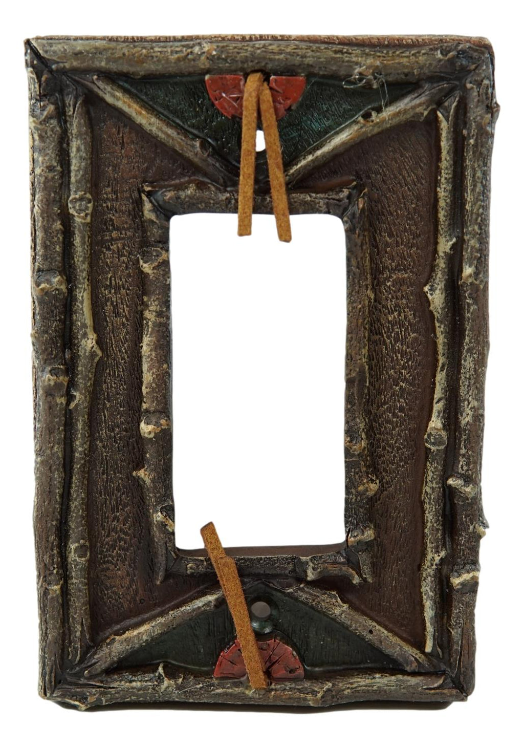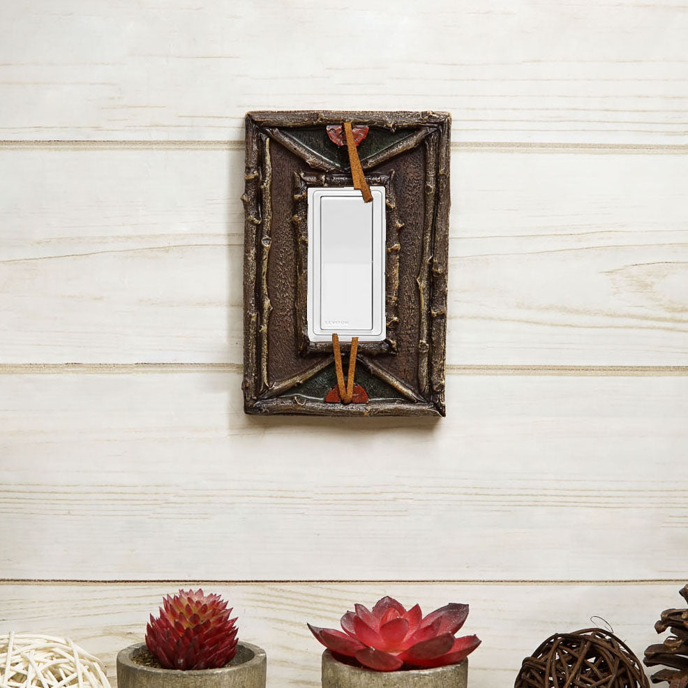 • These Southwestern Wall Electrical Cover/Switch Plates each measures 5.25" High, 3.5" Wide and 1" thick approximately. They fit standard wall socket receptacle. Each plate weighs about 6 ounces. • These Southwestern Wall Electrical Cover/Switch Plates are made of polyresin, textured and painted in faux rustic wood finish. Because it is a resin product, it can break if you over-tighten with the screw driver. • Western decor is all about spunk and spirit, bringing together the desert beauty of the southwest and all its inhabitants with rugged cowboy charm, tribal Indian flair and rustic good looks. Each sculpture is finished in faux wood look, branchwood borders and patterns, giving the sculpture a depth perspective as well as a woodlands warmth. This particular model does not have the turquoise accent on the plate. • This listing comes as a pack of 2 plates.