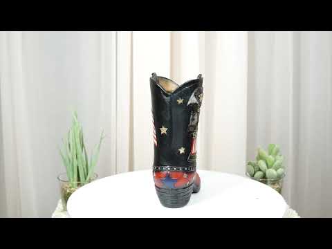 • A truly unique boot accent decor or as a floral vase/planter showcasing the patriotic American Bald Eagle Clutching the Liberty Bell! Embellished in the colors of the American Flag, we add western stars, faithful cross and silver nailheads to the sculpture to elevate the rustic accent boot.