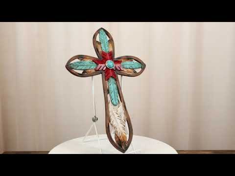 • This wall cross is made up of multiple eagle feathers in different colors; turquoise being the main theme. At the center of the cross is a crackled turquoise rock surrounded by red arrows that extend out to feathers.