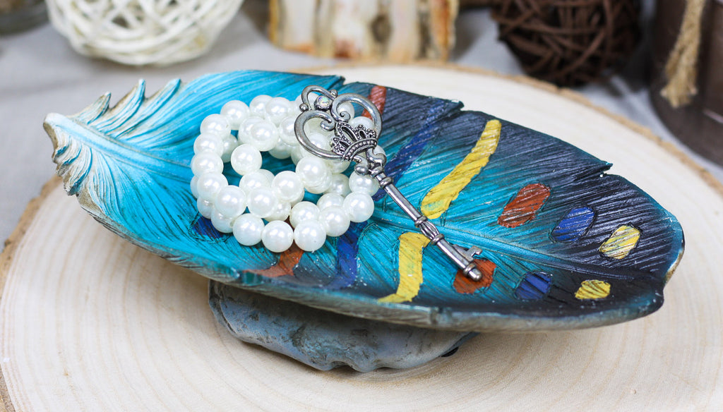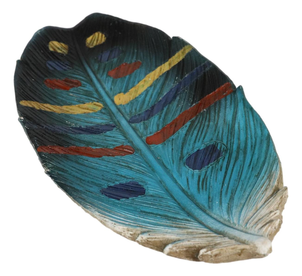 • This beautiful feather is hand painted in multiple splashes of colors from blue of all shades, to yellow, red and white. It is convenient for organizing your coins, jewelry and other knick knacks.