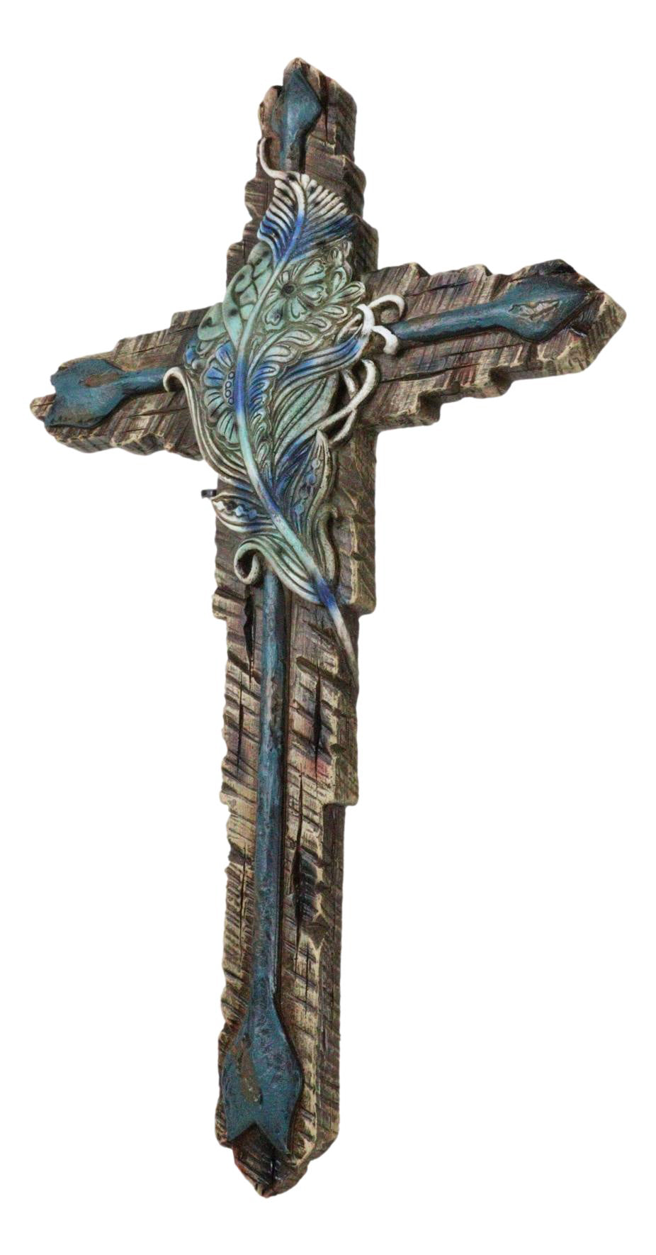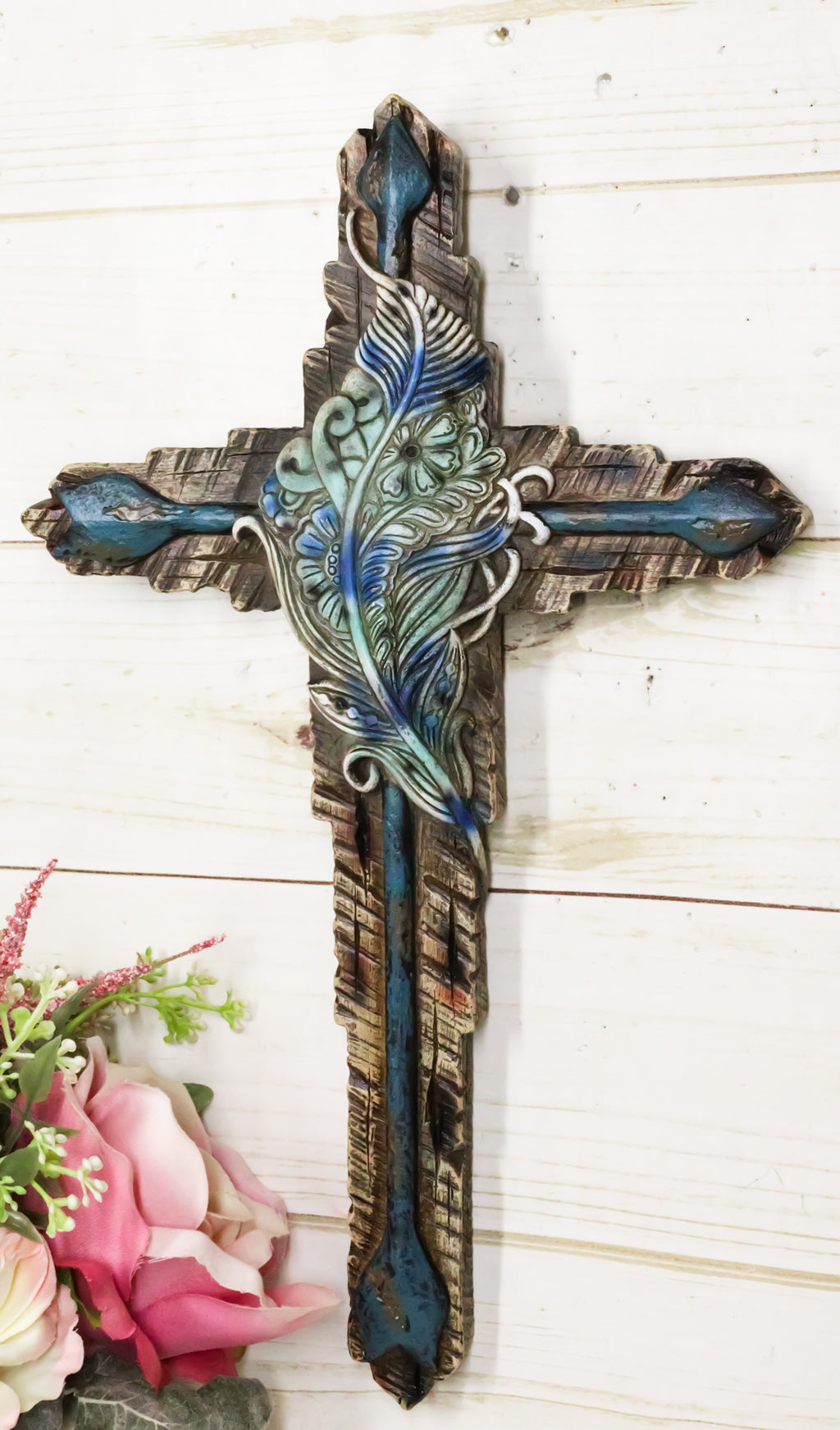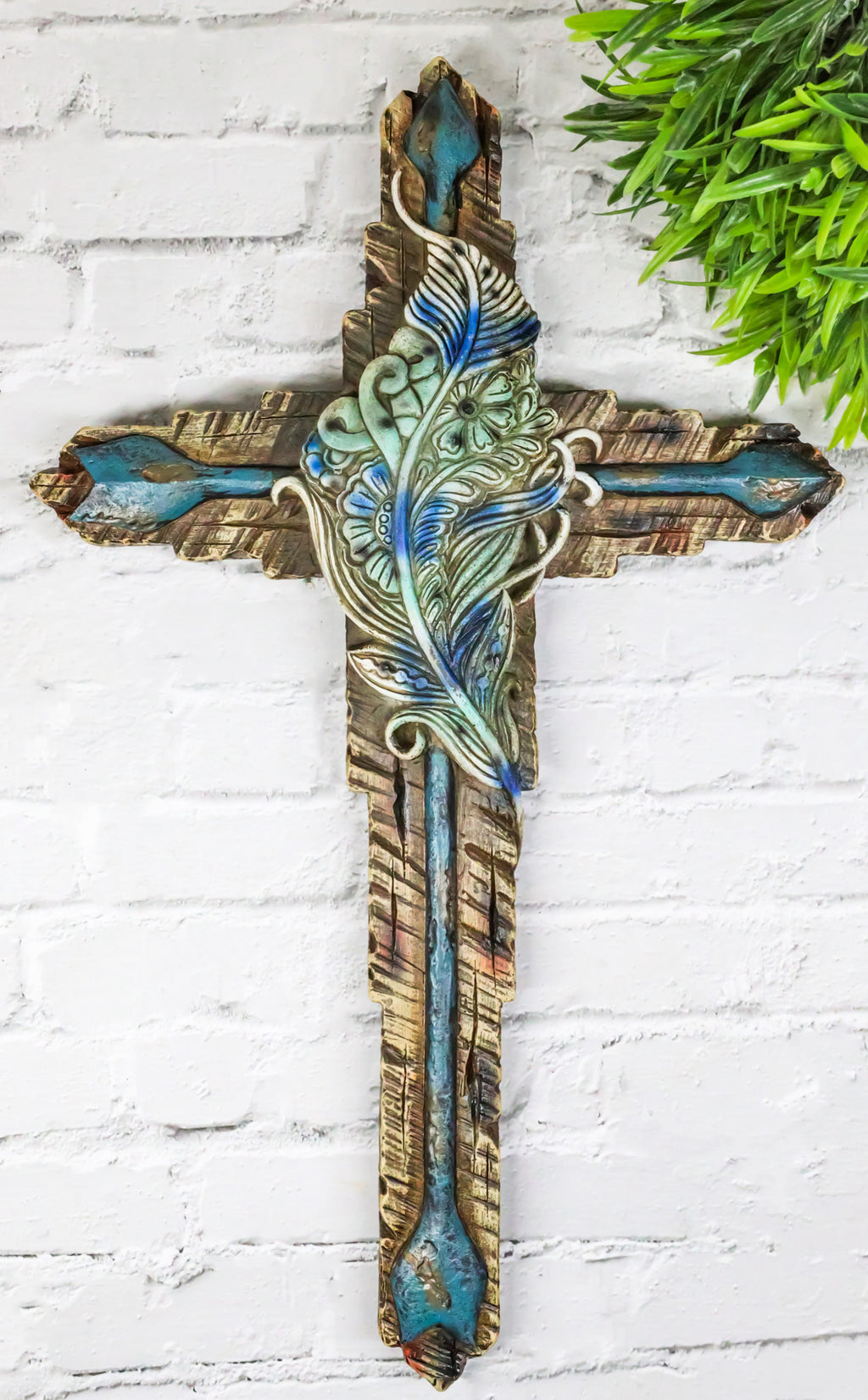 Southwestern Tribal Indian Feather And Turquoise Arrows Faux Wooden Wall Cross