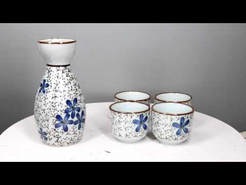 Japanese 7oz Blue White Sakura Cherry Blossoms Sake Flask With Four Cups Set