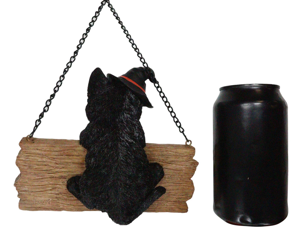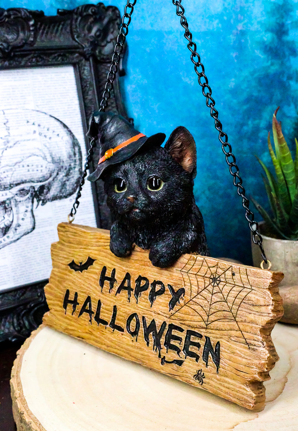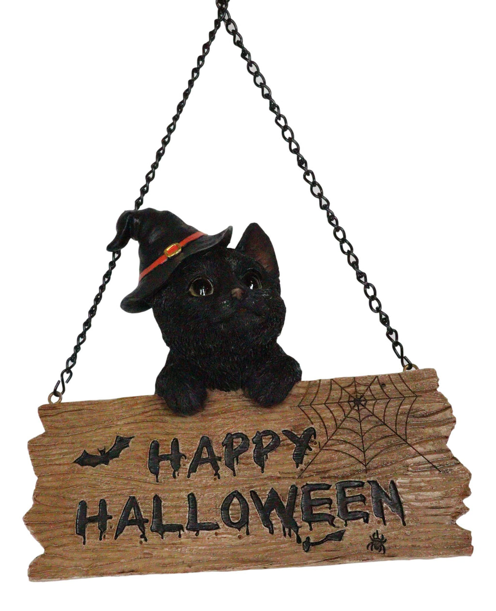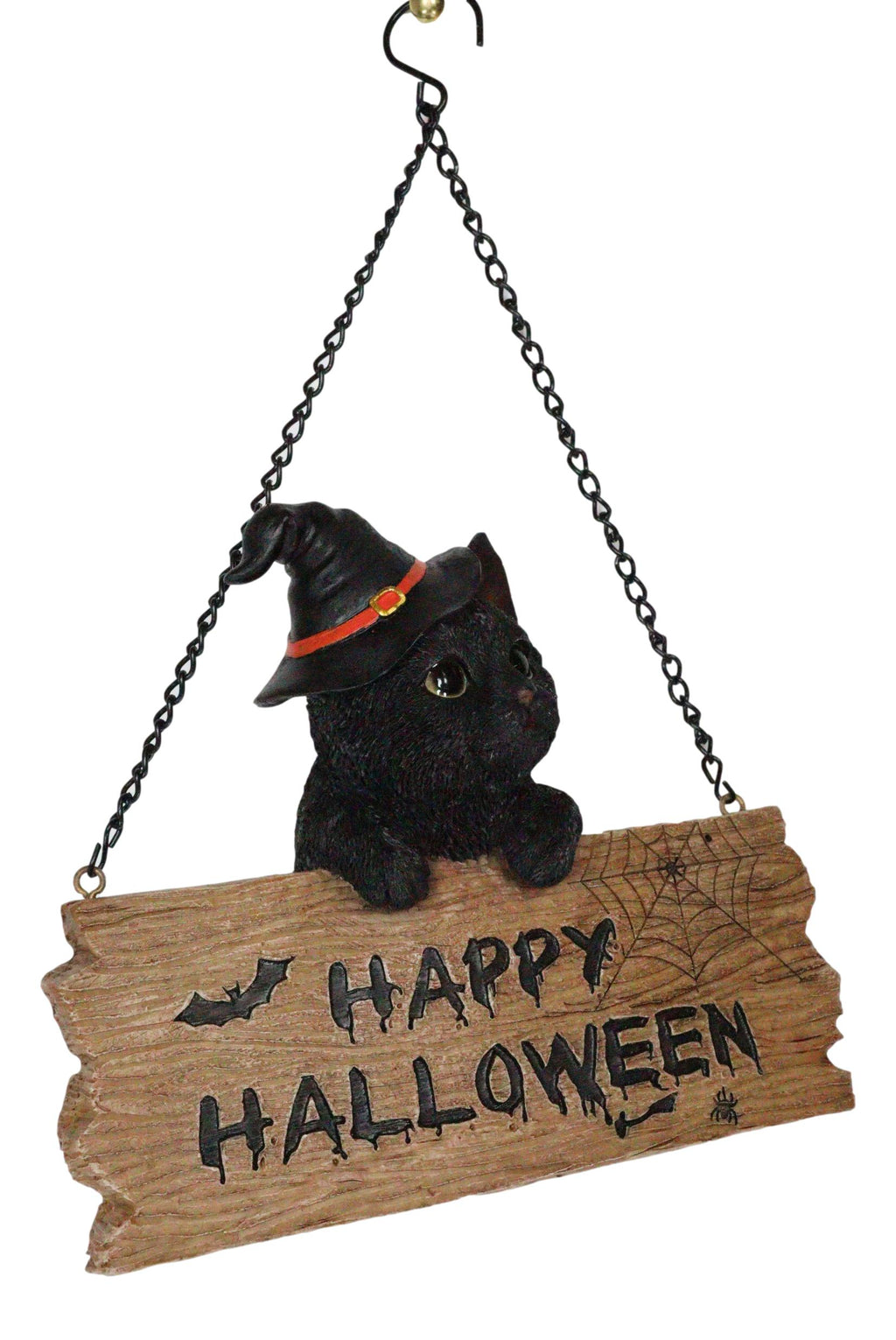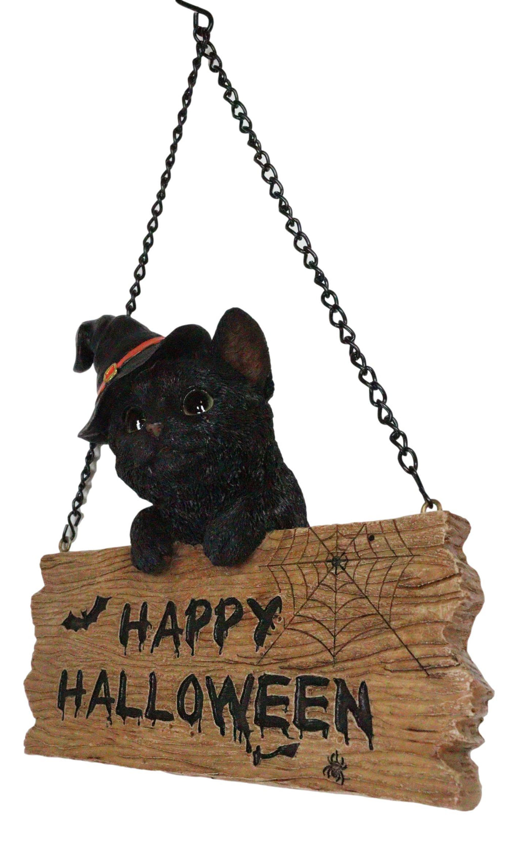 • This Adorable Black Cat Ceiling Or Branch Hanger Figurine measures approximately 5.75" tall, 7" wide and 3.25" thick approximately. The metal chain with a hook end hangs about 4" above the head of the figurine. The sculpture weighs 13 ounces. • This Adorable Black Cat Ceiling Or Branch Hanger Figurine is made of designer composite resin, hand painted and polished individually. Color tone may vary from pictures. • It is now witching hour! A black cat is perched above a wooden plank sign that says Happy Halloween... with spider webs and a bat carving. The black cat is wearing a black witch hat with red stripe. The plank sign has a 10" metal hanging chain with as S hook end. You can hang this sculpture or just set it on your countertop, shelves or desks. • This is an Ebros Gift exclusive collection. Props in photos are not included with the item.
