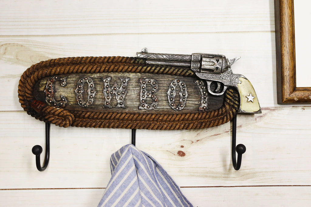 Ebros Cowboy Sign Braided Ropes Six Shooter Revolver Gun Pistol Wall 3 Peg Coat Hooks