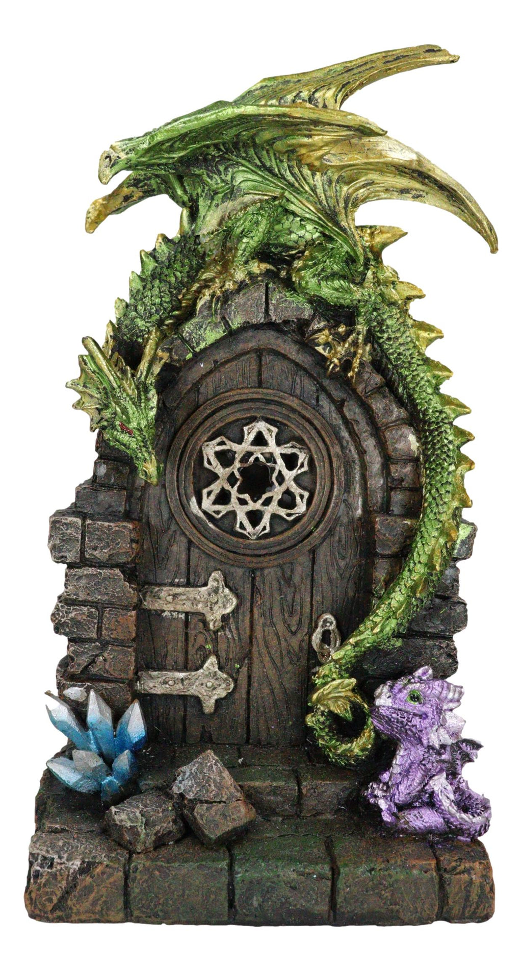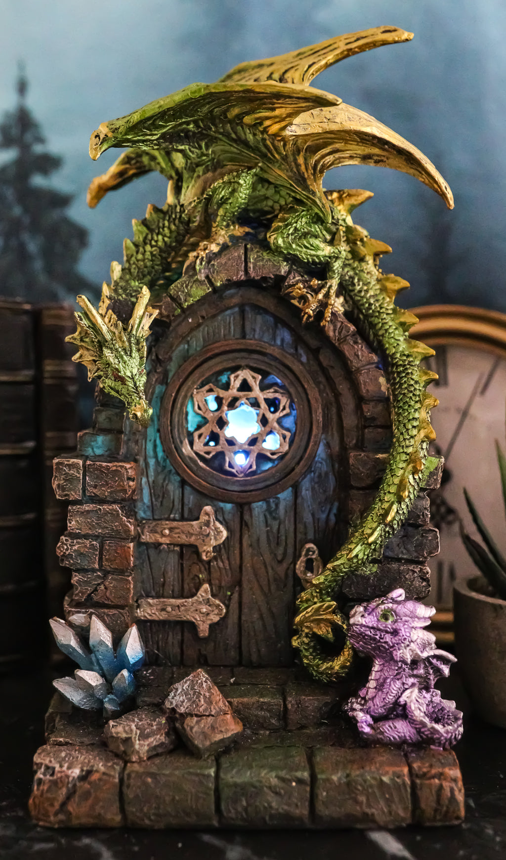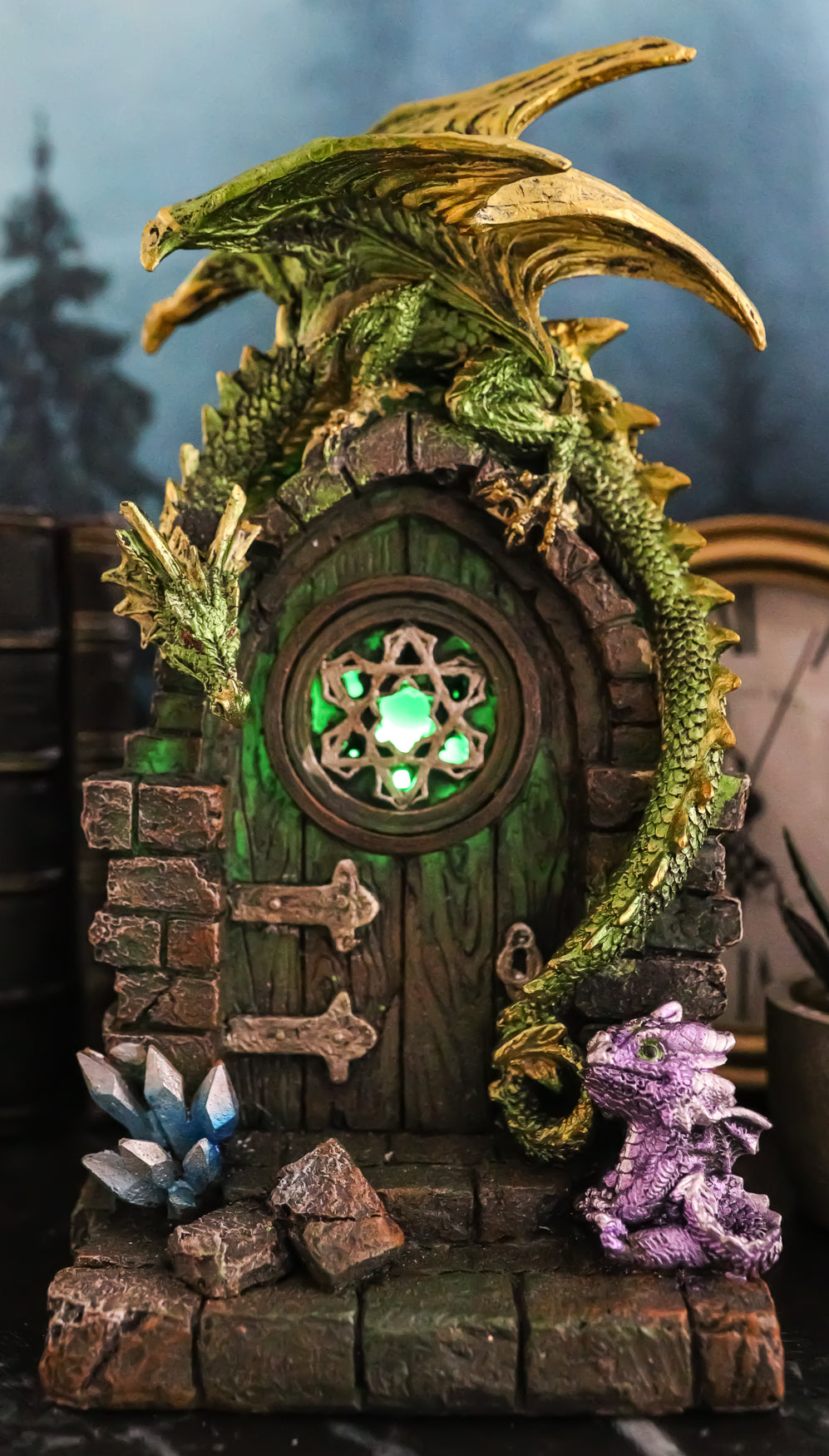 • A shining emerald dragon with gold accents perches atop the archway brick columns over an ancient wooden door. A pink baby dragon perches at the foot of the door and a blue crystalline cluster blossoms across from it. When LED is lit, colorful arrays of light shines behind the door. It will serve as a wonderful accent and a night light for any home.