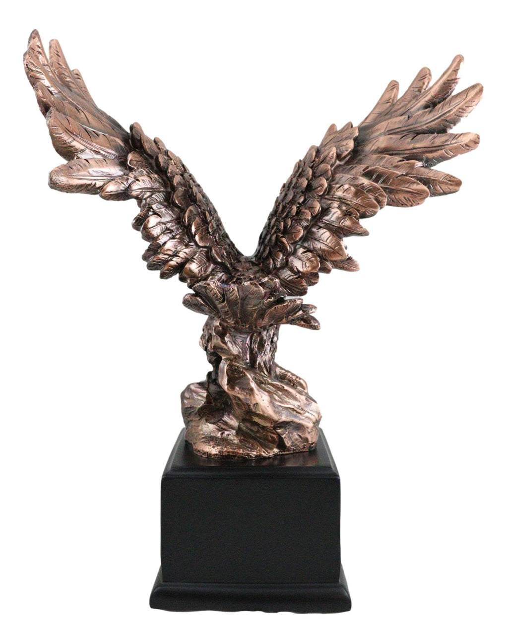 • This Majestic Bald Eagle Figurine is made of the highest quality resin, undergoing the process of bronze electroplating giving it a uniform shine on the inside as well as the surface of the figurine. To add sculptural aesthetics and display worthiness, we add accent faux black wooden base to the sculpture.