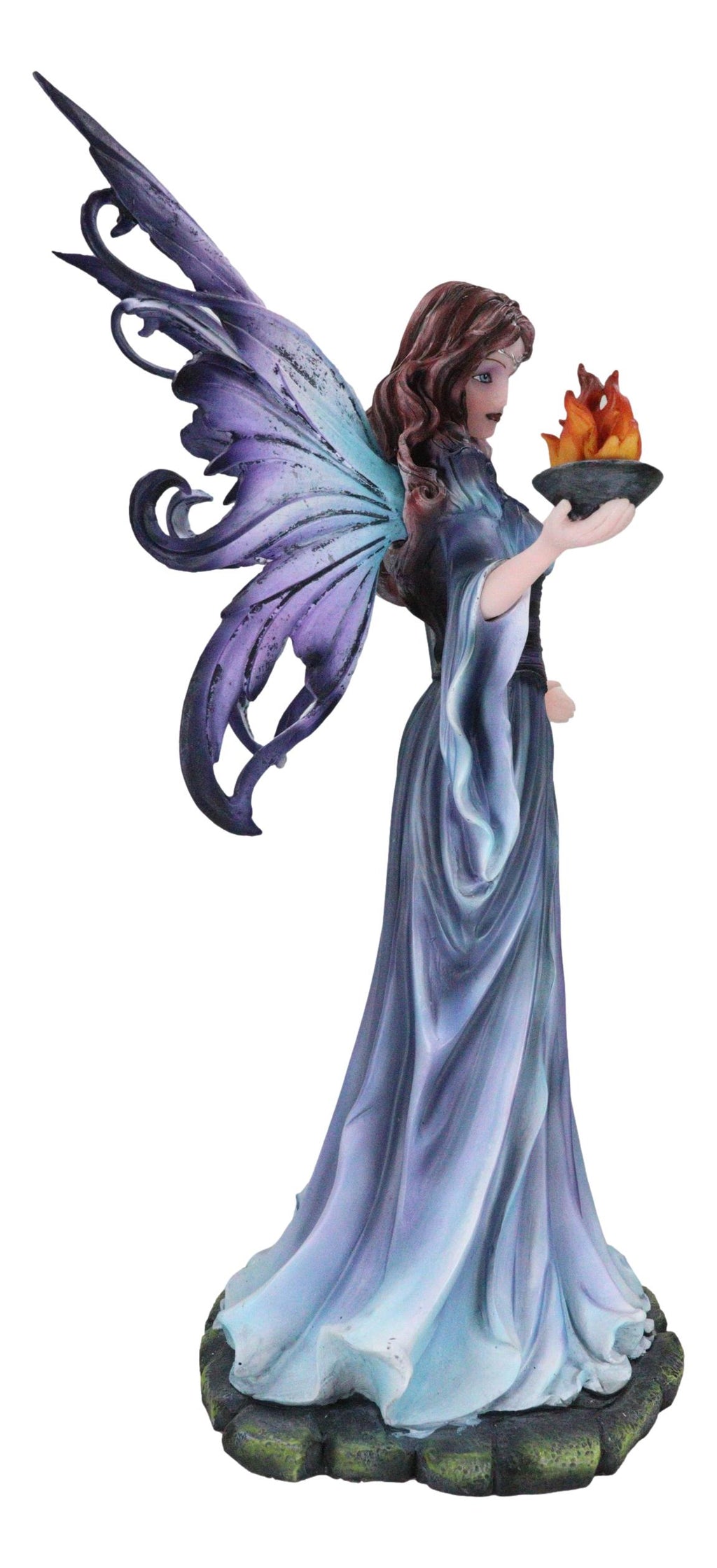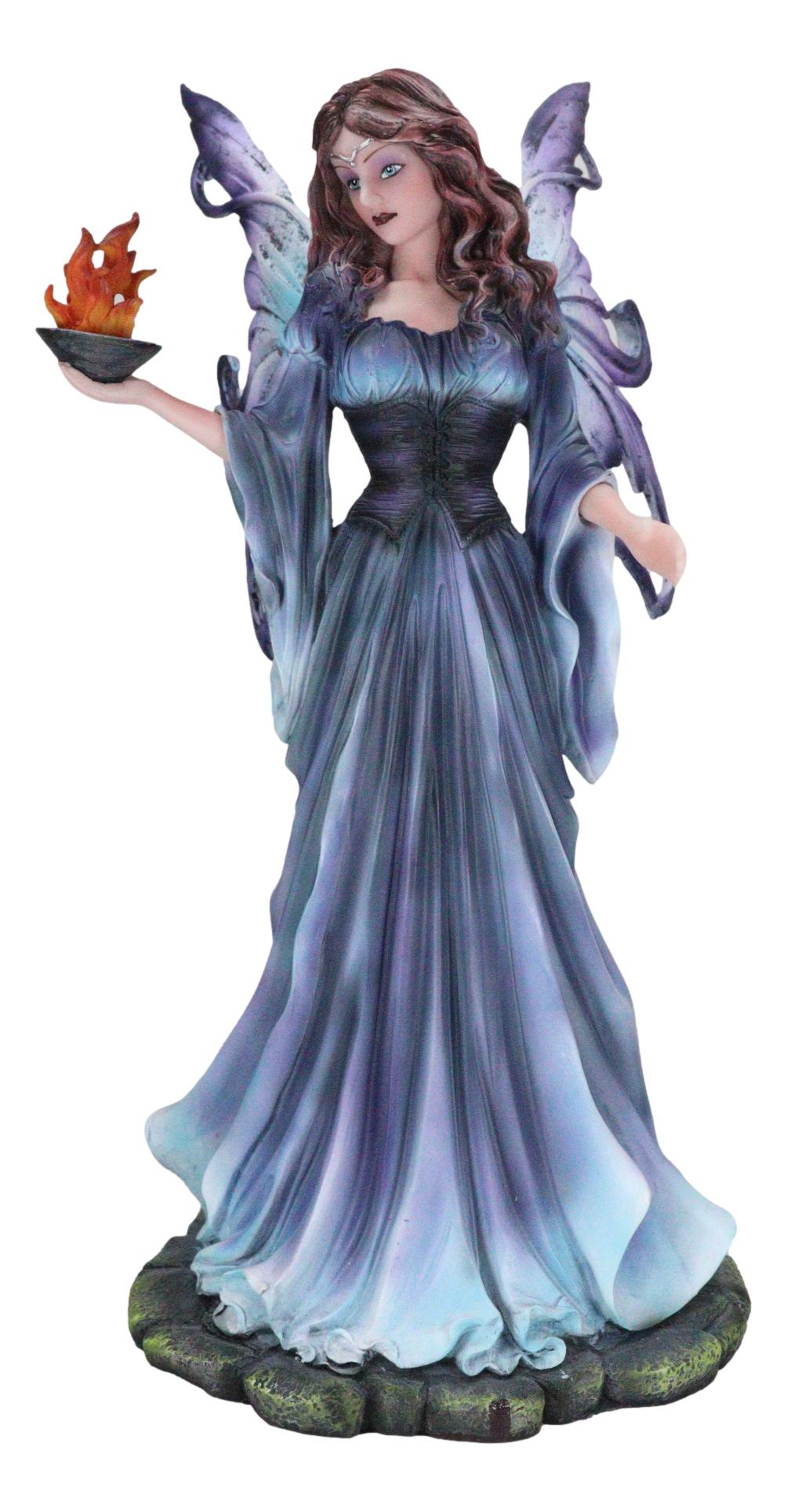 • The Fire Fairy Queen Statue symbolizes the fire elemental sign. Dressed in a long gown with many shades of non luminous flame blue. Her colorful wings are open behind her and she holds a a pyre flame on one hand. The Fire Fairy Statue is stunning and would make a great piece to display anywhere in your home.