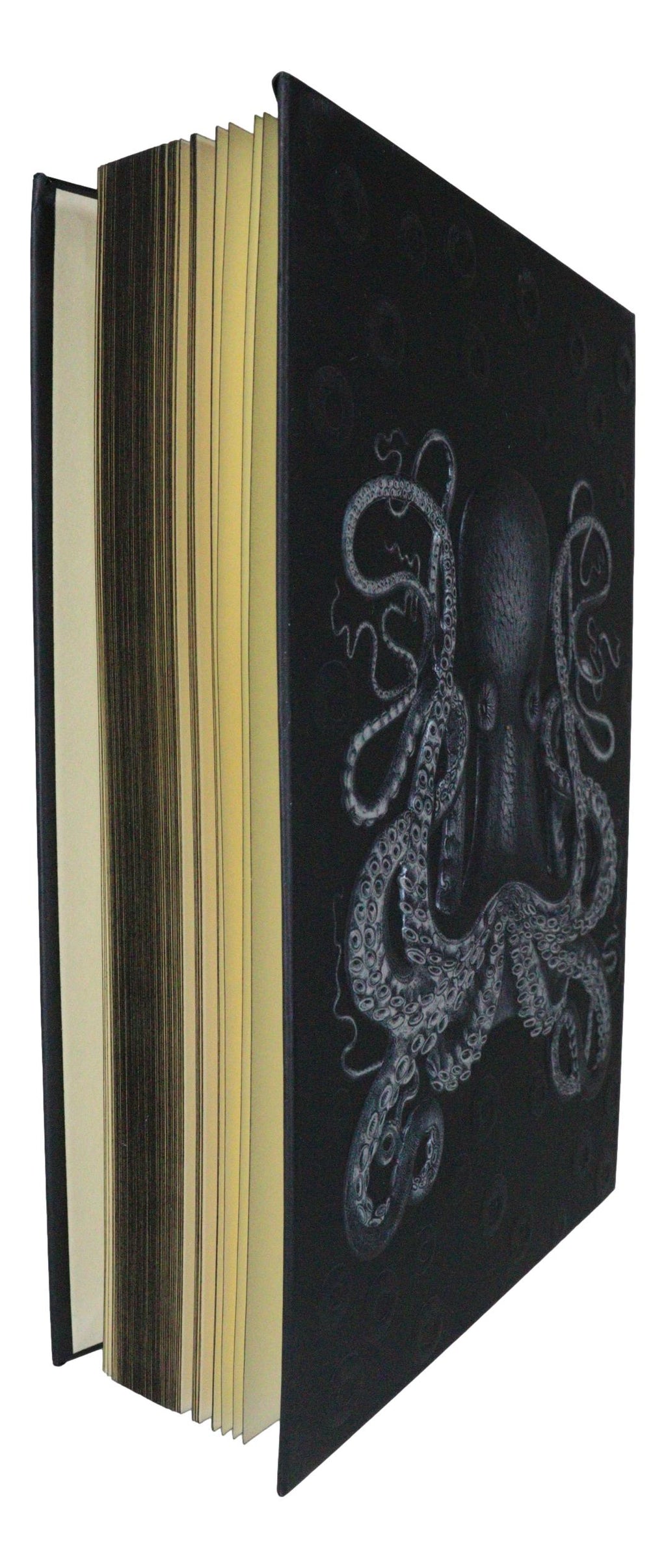 • The Kraken Octopus Skull Journal is a wonderful place to keep your private thoughts, spells, or for recording your regular shopping list. This black hardcover journal features an embossed Kraken Octopus design on the front. Intricate tentacle arms proliferates the image and abstract bubbles fill the background. It is equipped with a bookmarking ribbon.
