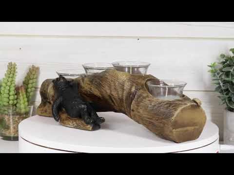 • Keep votive candles off your tabletop surface with this polyresin candle holder stand featuring a cute black bear sleeping on a long log. 4 votives fit aesthetically on it in a linear fashion. Glass votives holders are included but votive candles are not.